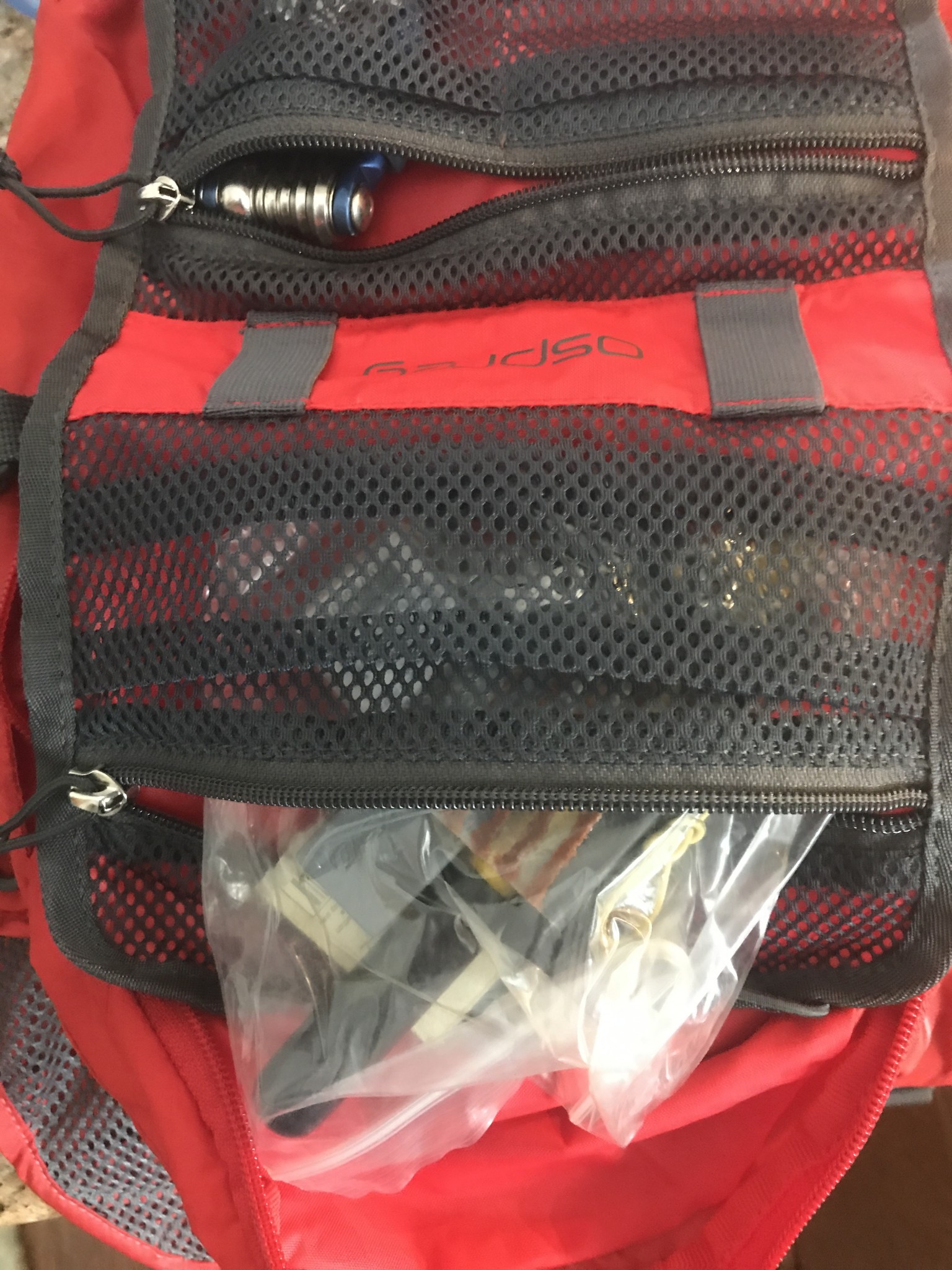 The storage feature that makes the Raptor 10 stand out for mountain bike riders is at the bottom of the pack. As you look at the pack, there is a small zipper that is horizontally oriented, in the lower part of the pack. Zip it open, and you'll find an ingenious detachable tool roll.
