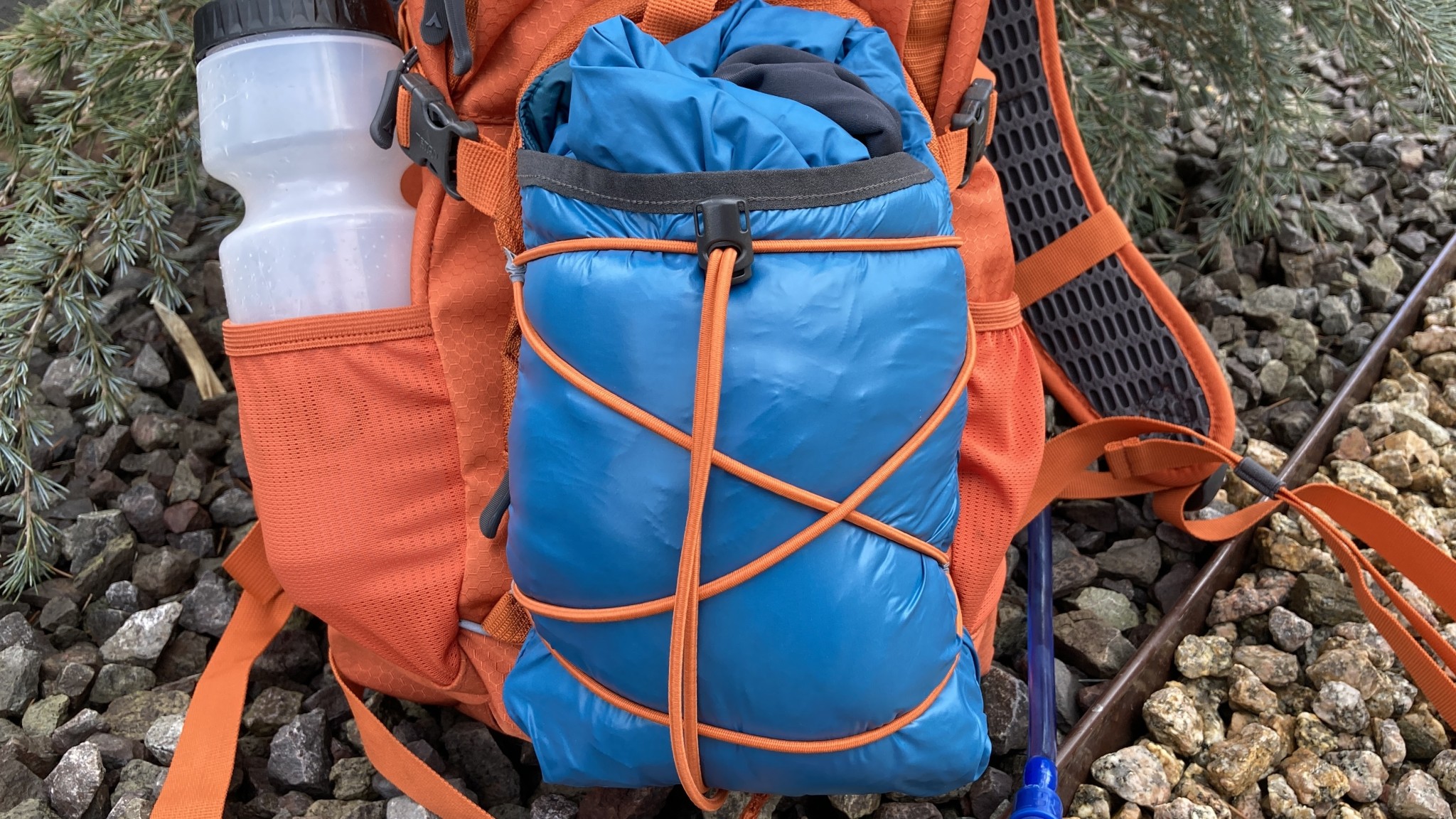 The Oasis has 18 liters of storage with options to increase its capacity through bungee cords and side mesh pockets. Although some of this pack's features lack the refinement found in other packs, its storage impressed our testers. There are two smaller zippered pockets on the front of the pack. The top pocket lacks internal organizing pockets while the bottom has two mesh pockets and a clip. These pockets are easy to access, have two-way zippers with large pulls, and are built to stick out from the pack. They are both spacious and can hold quite a bit. These two pockets work well for storing smaller items like keys, snacks, and wallets.