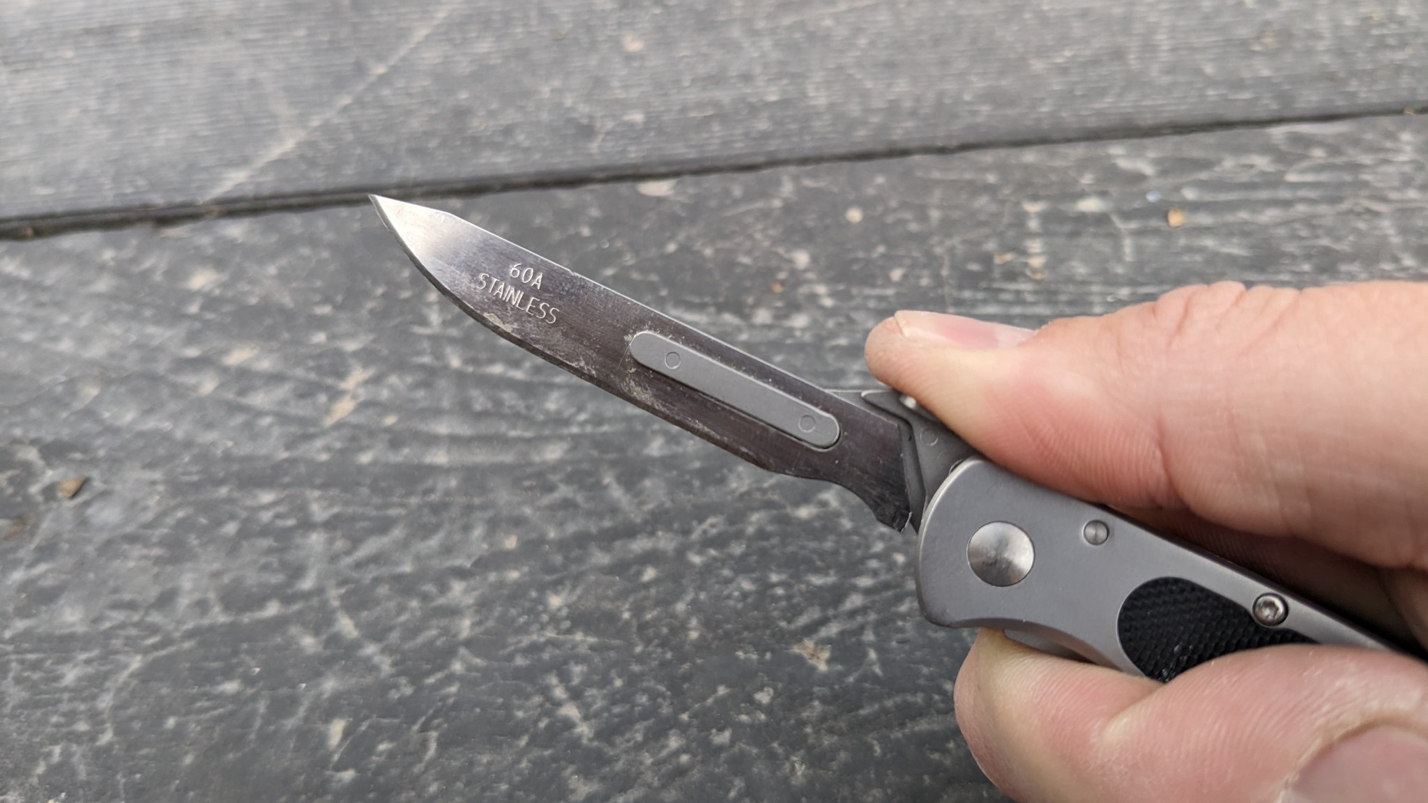 The Havalon Piranta knife is built to work with their '60a' scalpel-style blades. Havalon's parent company, Havel's Inc., is exclusively a scalpel company. Surgical-grade scalpels come in a variety of styles. Interchangeable blades are pretty common in that setting. The blade change interface is fairly standardized but not perfectly universal. Surgical #60 scalpel blades are built to work on #4 handles. As best we can tell, the Havalon 60a blades are the same as #60 but a little thicker. If this deduction is true (and we've done a fair amount of digging), only Havalon #60a blades will work on the Piranta. This shouldn't be a problem. It is a good blade shape, works well, and is widely available.