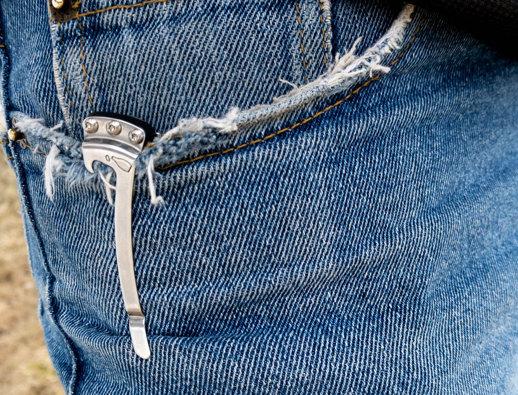 The pocket clip of the Skeletool KB is tight and visually unobtrusive outside your pants pocket. Its configuration means that a little of the knife peeks out above your pocket edge. The pocket clip is fixed in one orientation (tip-down, best in your right pocket).