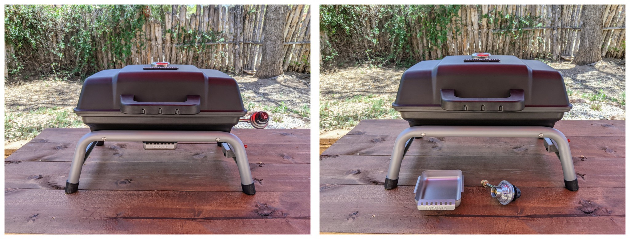 The removable propane regulator is the only piece that comes apart from the body of the 240 to enhance portability — that and the drip tray, which can easily rattle out of place on bumpier rides. Although this 16-pound aluminum grill is easy enough to pick up and move from one side of the picnic table to the other, a packed size of 3.1 cubic feet is less than desirable for loading up to take to the park. And unlike some of the other portable options offered by Char-Broil, the 240 has no latch to secure the lid.