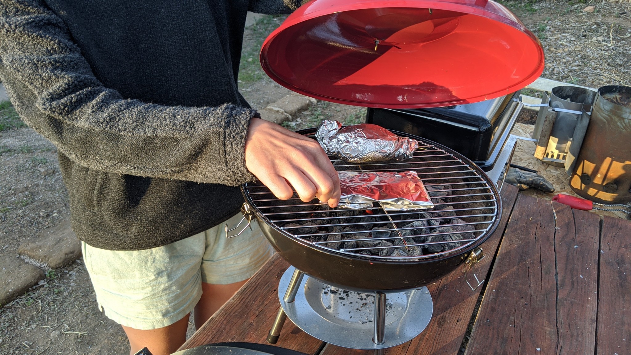 This simple grill doesn't sport any particular features to help you cook through adverse weather, but we found that it performed pretty well when it came to wind resistance. Although it is not deep, the grate is inset enough to protect the bottom of a chimney from scattering flaming debris when starting the coals on a windy day. The lid latches do a really good job of keeping it attached to the grill, but be careful where you set it down when you take it off… the wind might just pick it up and carry the lightweight aluminum lid away!
