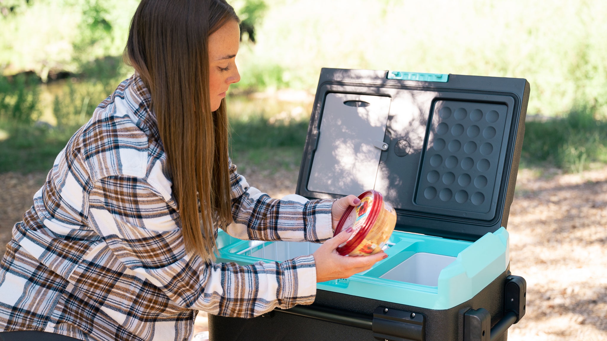 It features an internal light, allowing you to see what's inside in the dark. The lid can also be adjusted to open from either direction. A cutting board is stored inside the lid. We appreciated this feature because we can never seem to find the other cutting board we intended to pack.
