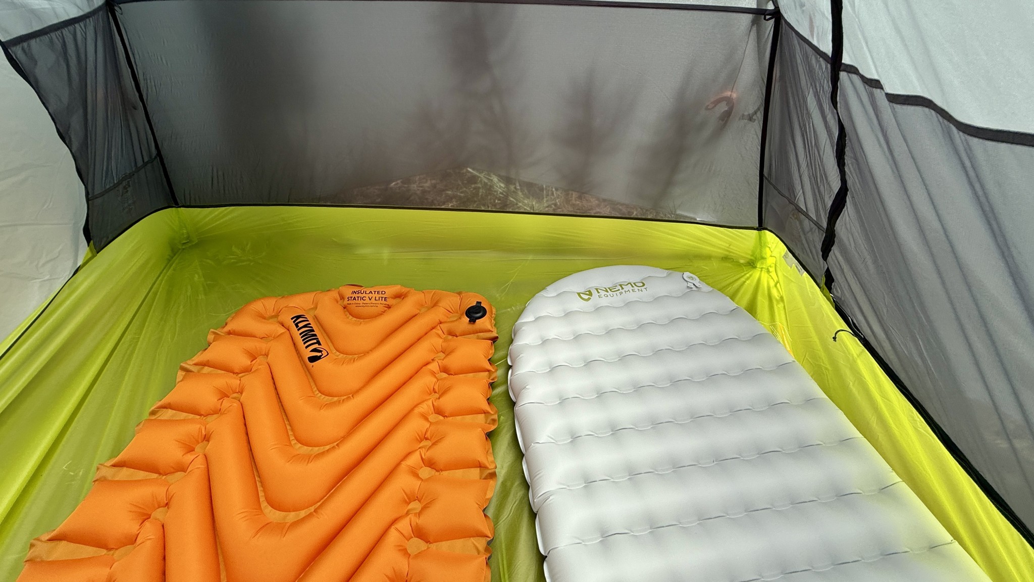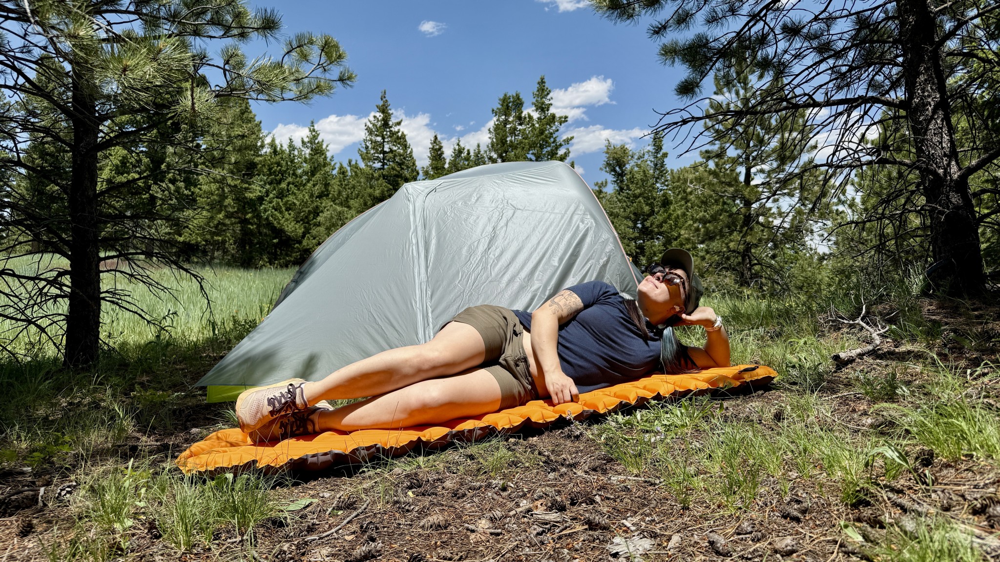 Those poofy V baffles do come at a slight cost, though, as they are just deep enough that we wouldn't necessarily want to put our face directly onto them. We'd recommend stashing a lightweight backpacking pillow in your pack for extra neck comfort. That being said, the pad was excellent for reading and lounging inside the tent, or any activity when you're propped up on the pad a bit.