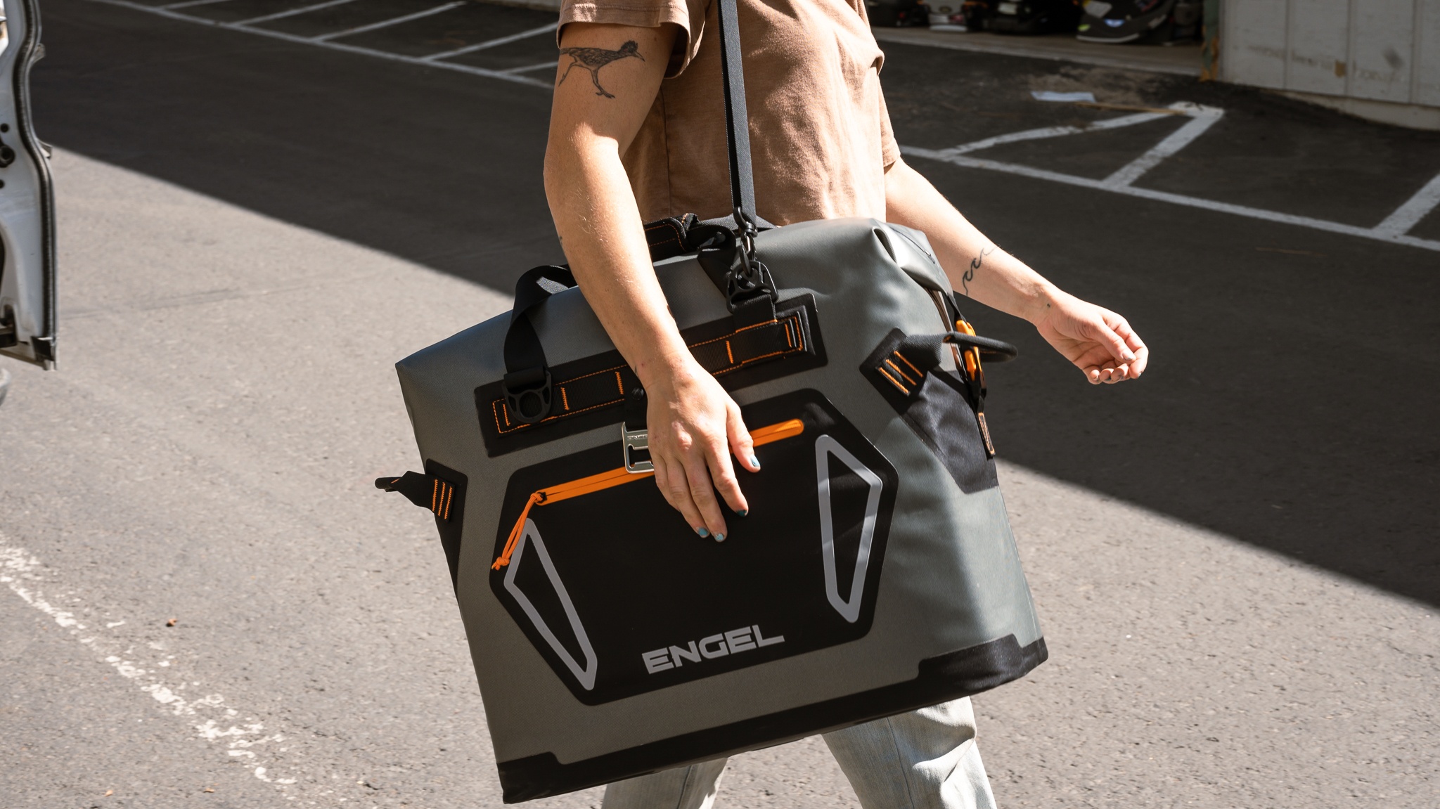 Portability is the only category where the Engel didn't receive top-notch scores. As the largest cooler in this review, it makes sense that it is a bit more challenging to carry around - especially when full. All things considered though, we are pleasantly surprised with the portability of this model, especially when you take its overall size into account. The shoulder strap makes for a fairly comfortable messenger-style carry. Rather than being attached to the ends of the cooler, like most others with a shoulder strap, the Engel's strap is attached near the ends but on the front and back of the cooler. This arrangement allows the whole thing to sit closer to your body to avoid bashing into the backs of your knees with every step. It can also be reversed to carry just as easily over the opposite shoulder when the first one gets tired. Even better, the shoulder pad attached to the strap has seams sewn across the padding to prevent it from all being squished unhelpfully to the ends after years of use. We also like how the Engel has four hefty plastic D rings near the top that can be used as tie-down points to the rack on the top of your Jeep or back of your quad, making this more than just a carriable cooler.