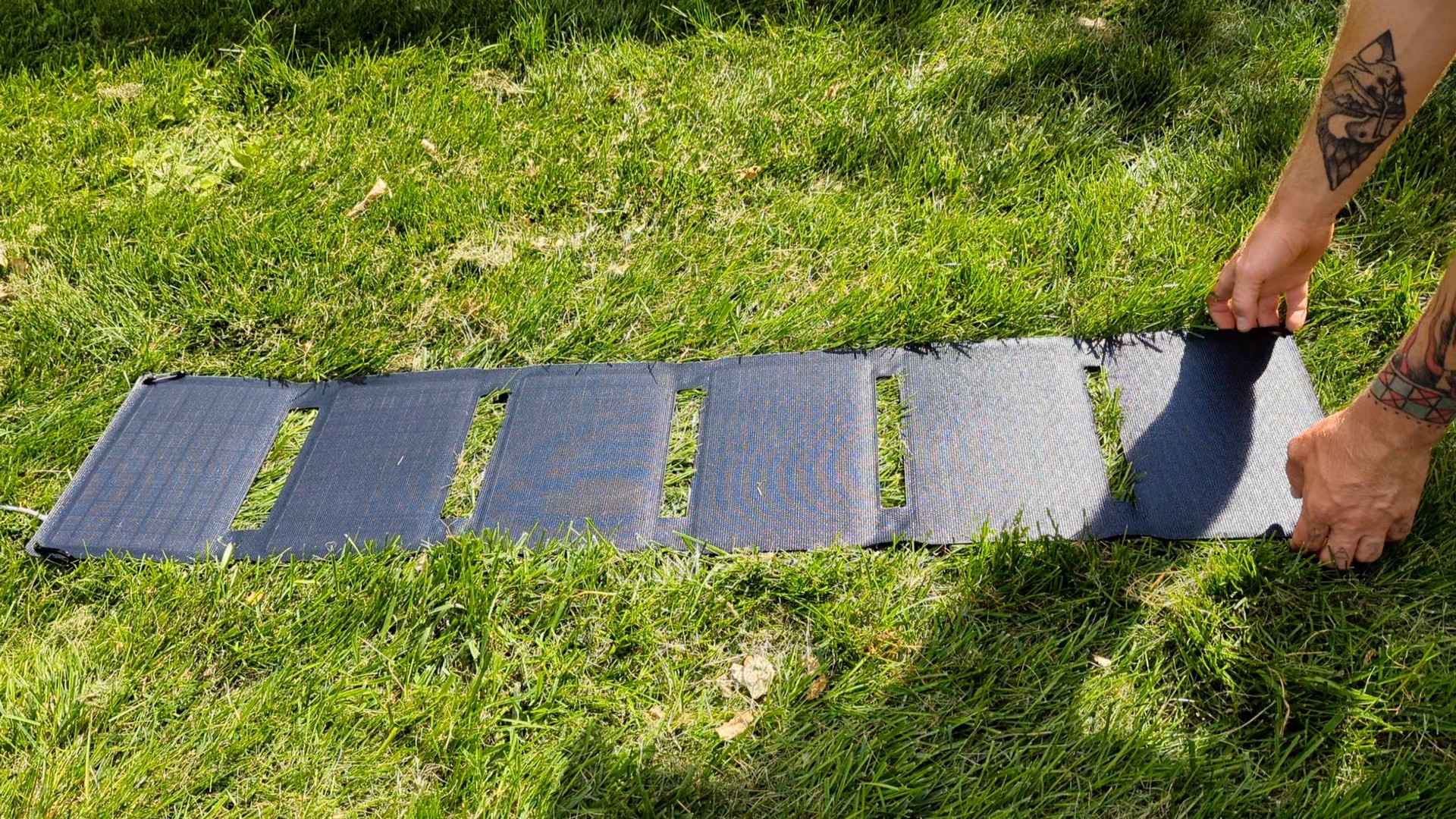 It has a total of six panels — that's a ton of surface area. It's rated at 40 watts of electricity, higher than most portable panels we tested. In our testing, it never actually put out 40 watts at once, but it still created more measurable watts than any other panel we tested. In our experience, most solar panels are rated for a wattage output that is only attainable in ideal conditions, so no panel ever puts out the watts it's rated for. The FlexSolar puts out more watts than most of the other panels we tested, whether or not it puts out the 40 watts it advertises.