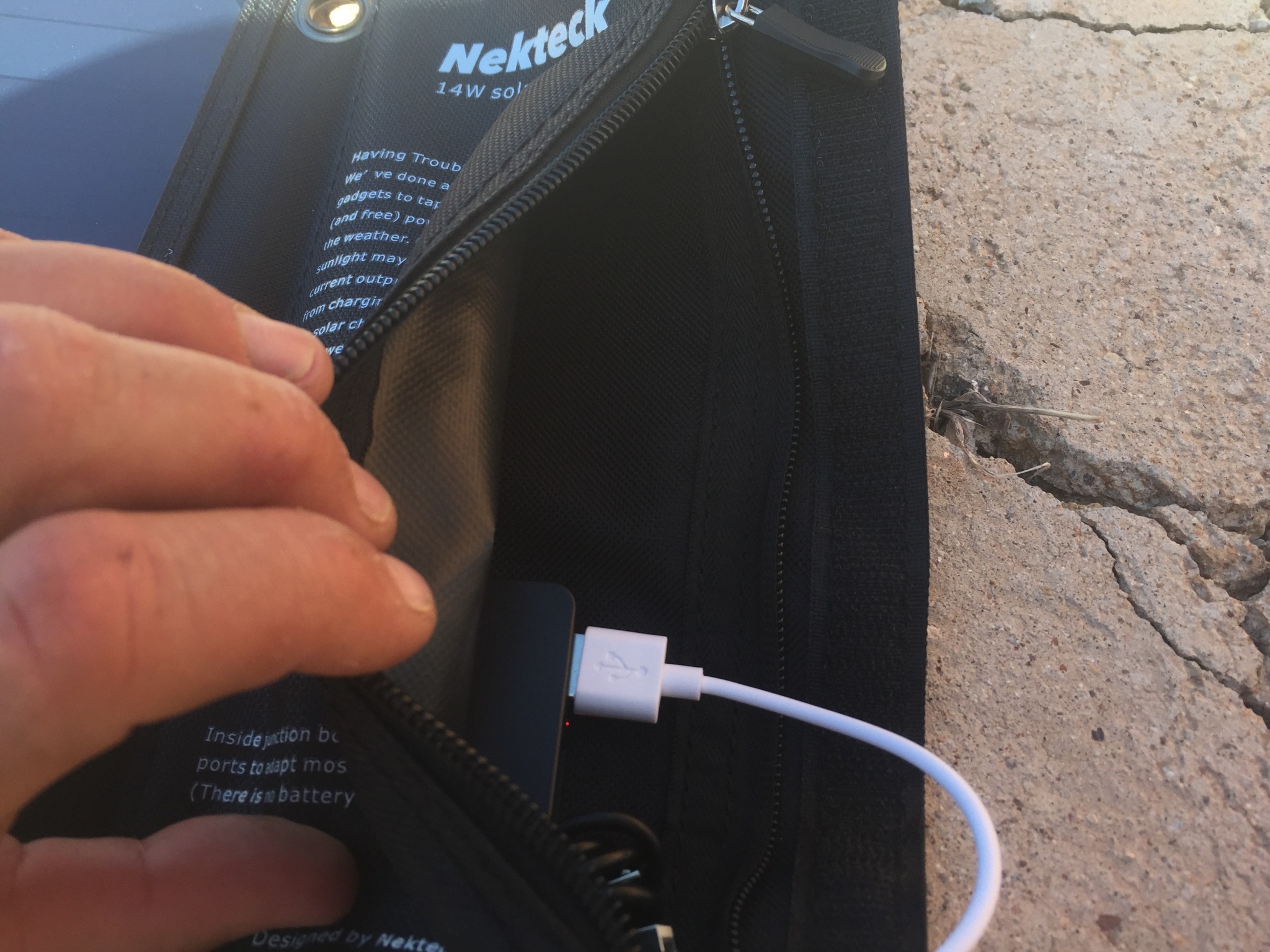 When we first set the 14W Nekteck panel out in the midday Southern Utah sun, its input from one USB outlet read 6W. After 10 minutes, the panel had charged our test battery 2%. The next ten minutes the panel went in and out of the sun, and its output went down to .6W, and the panel didn't charge our battery past 2%. The other panels in wattage category (the Anker 15W and the Instapark Mercury 10W) both managed to get the battery charged to 3%, and recovered a charge much better than this contender. The battery went into no-charge mode and did not charge our device until we unplugged and re-plugged it back in. We experienced a similar issue with the RAVPower 16W as it struggled to hold a charge in and out of the sun.
