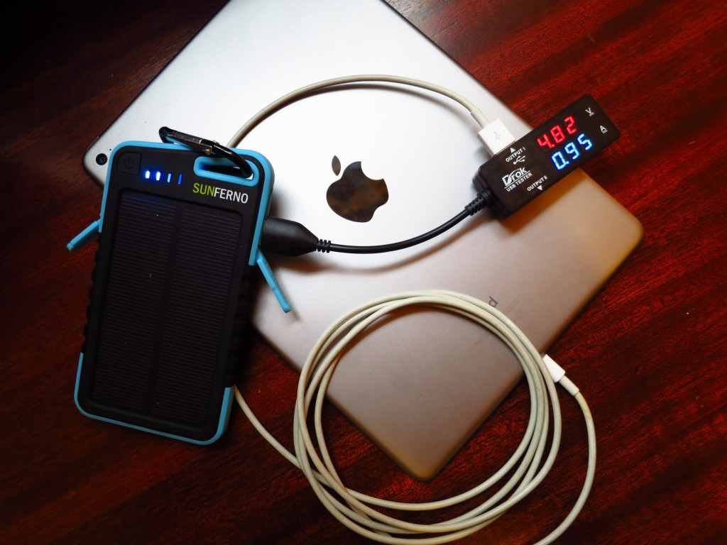 SunFerno says the battery will charge via sunlight in 12-14 hours--but that only half the battery can be charged via sunlight. This highlights the fact that this device is really only to be considered “emergency” back-up solar power. If you're lucky, you might get a little more juice from the sun. In our testing, the solar charging proved predictably unpredictable--and minimally functional.