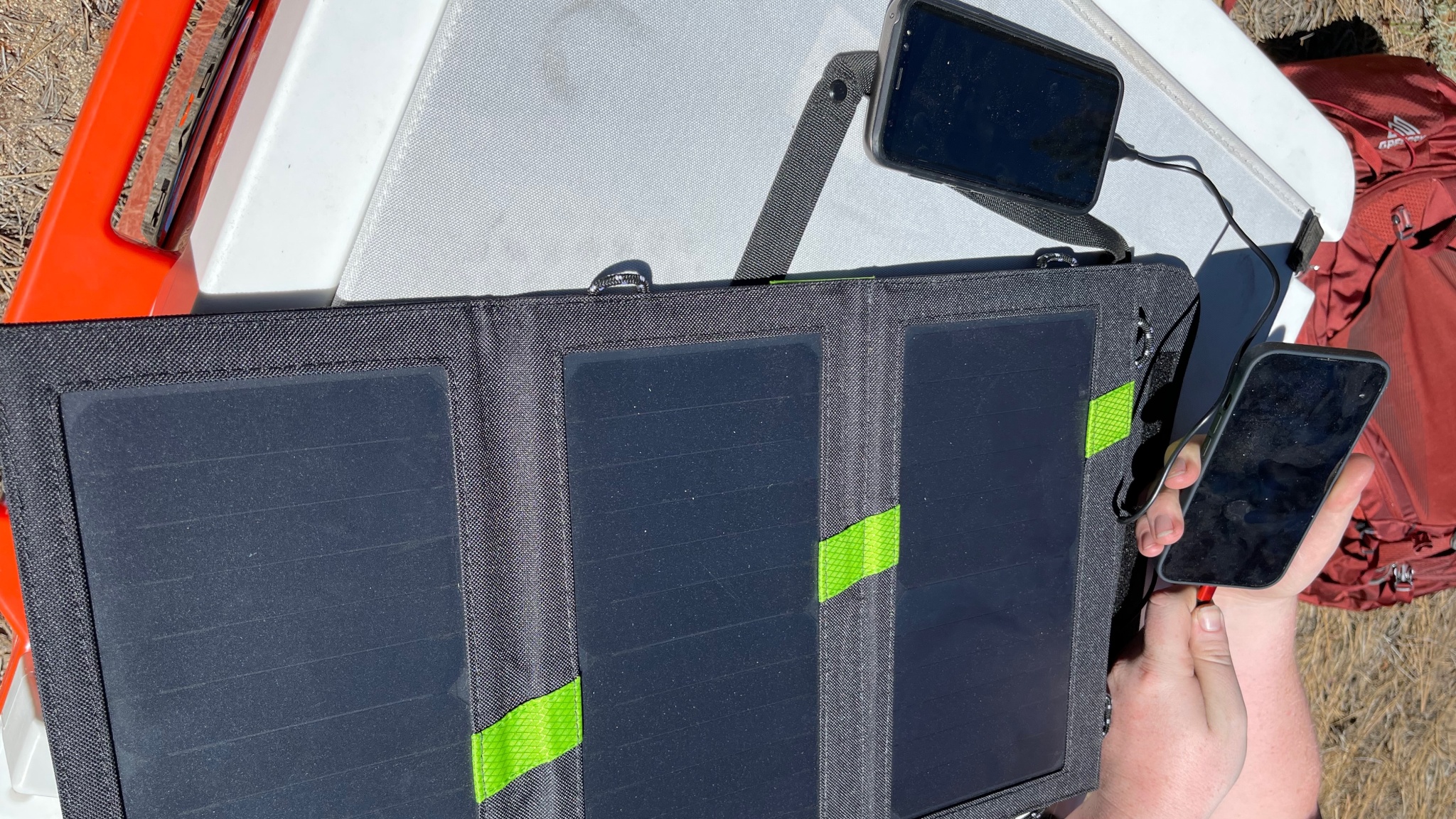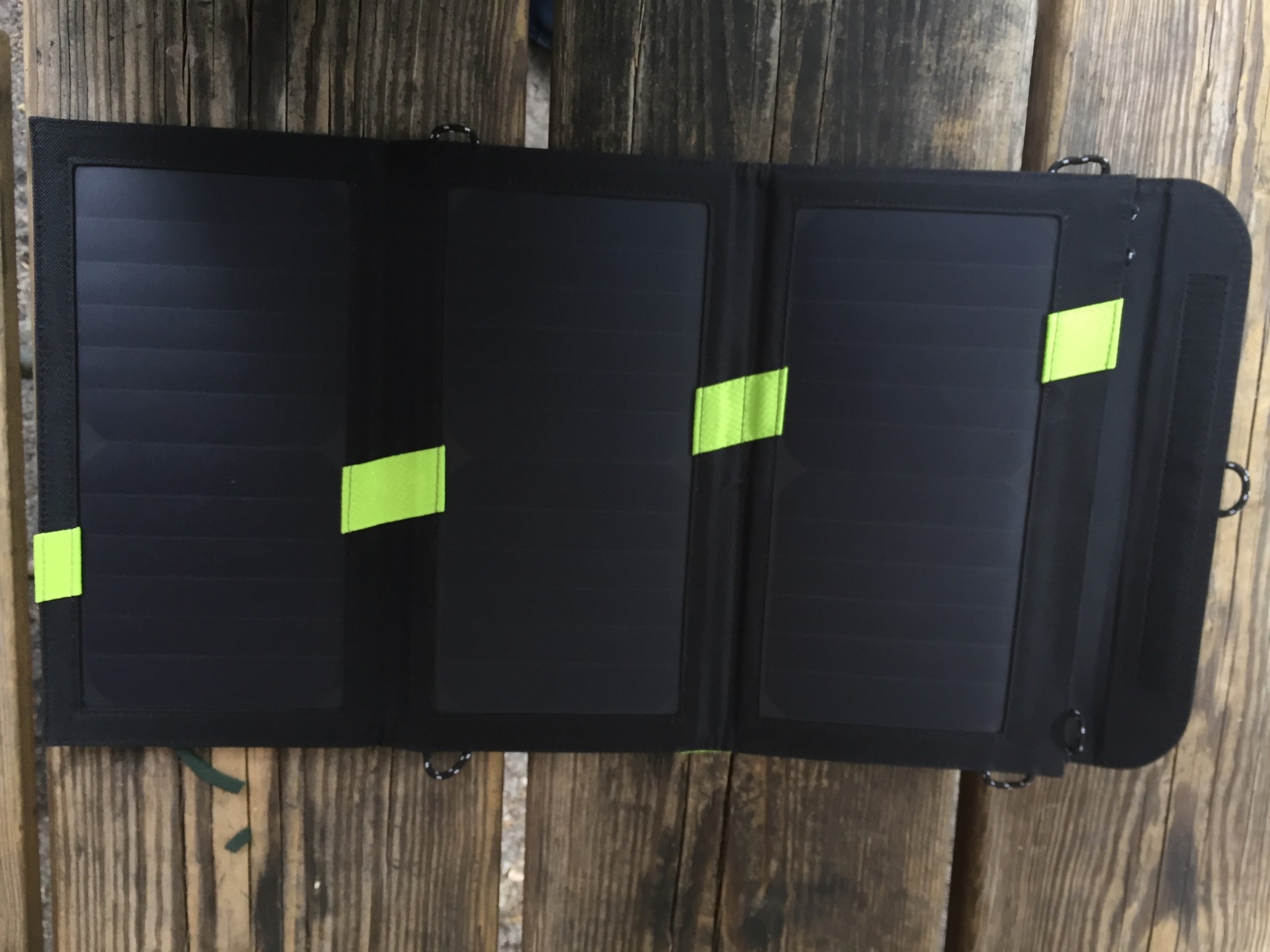 The panel also comes with several loops as well as carabiners. This makes it easier to dangle off a backpack, tree, or outside of a tent and allows for the panel to be angled more directly in the sun. We found that panels generally perform better when you point them directly at the sun. This means flat on the ground while the sun is high in the sky and at more of an angle as it gets lower in the sky.