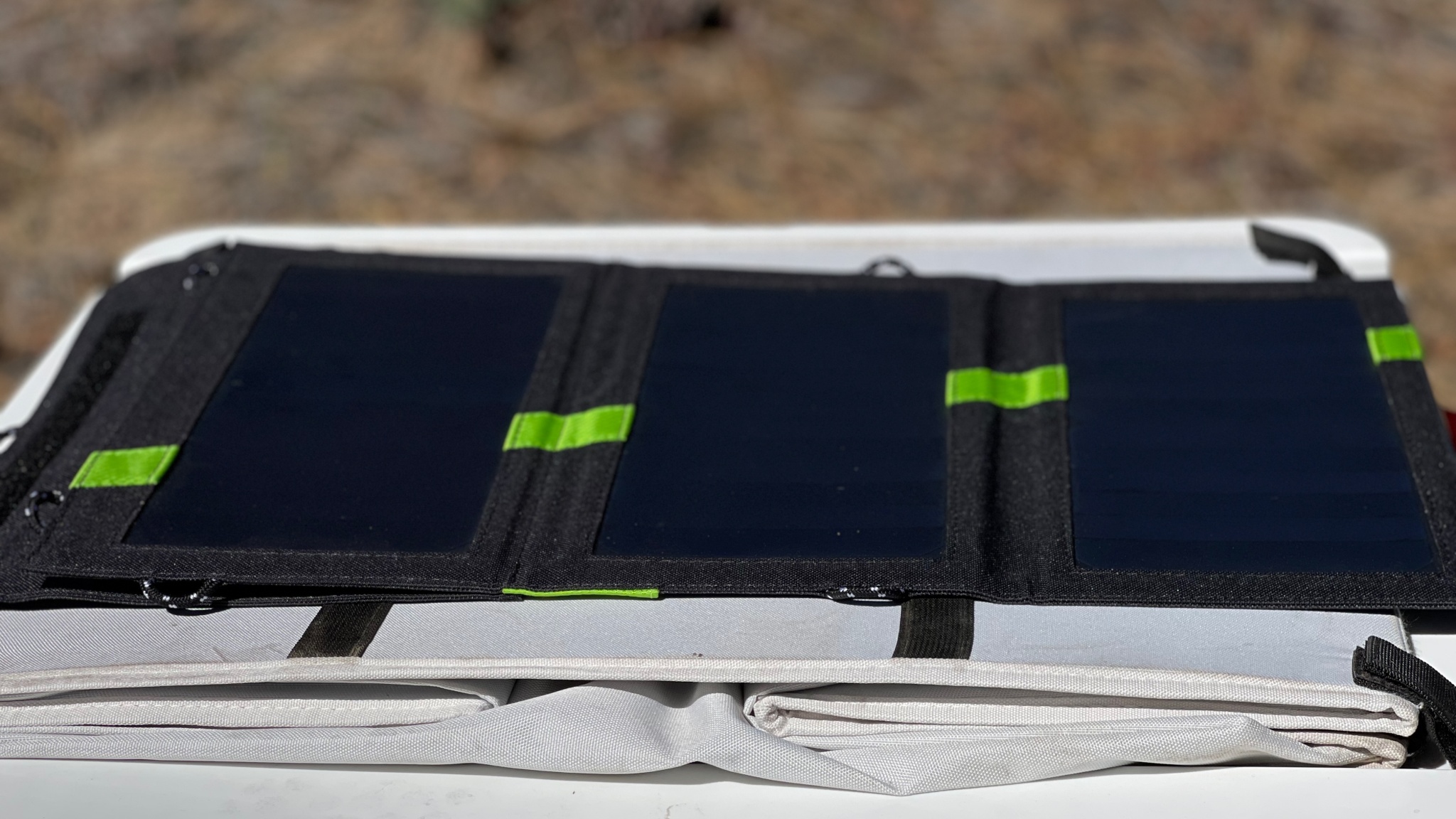 Velcro closures at the panel's top make it easy to fold up and store. The velcro opens easily, allowing the three panels to immediately begin harnessing energy from the sun. When closed, the tough canvas material stays put firmly to protect the solar panels from scratches and damage.