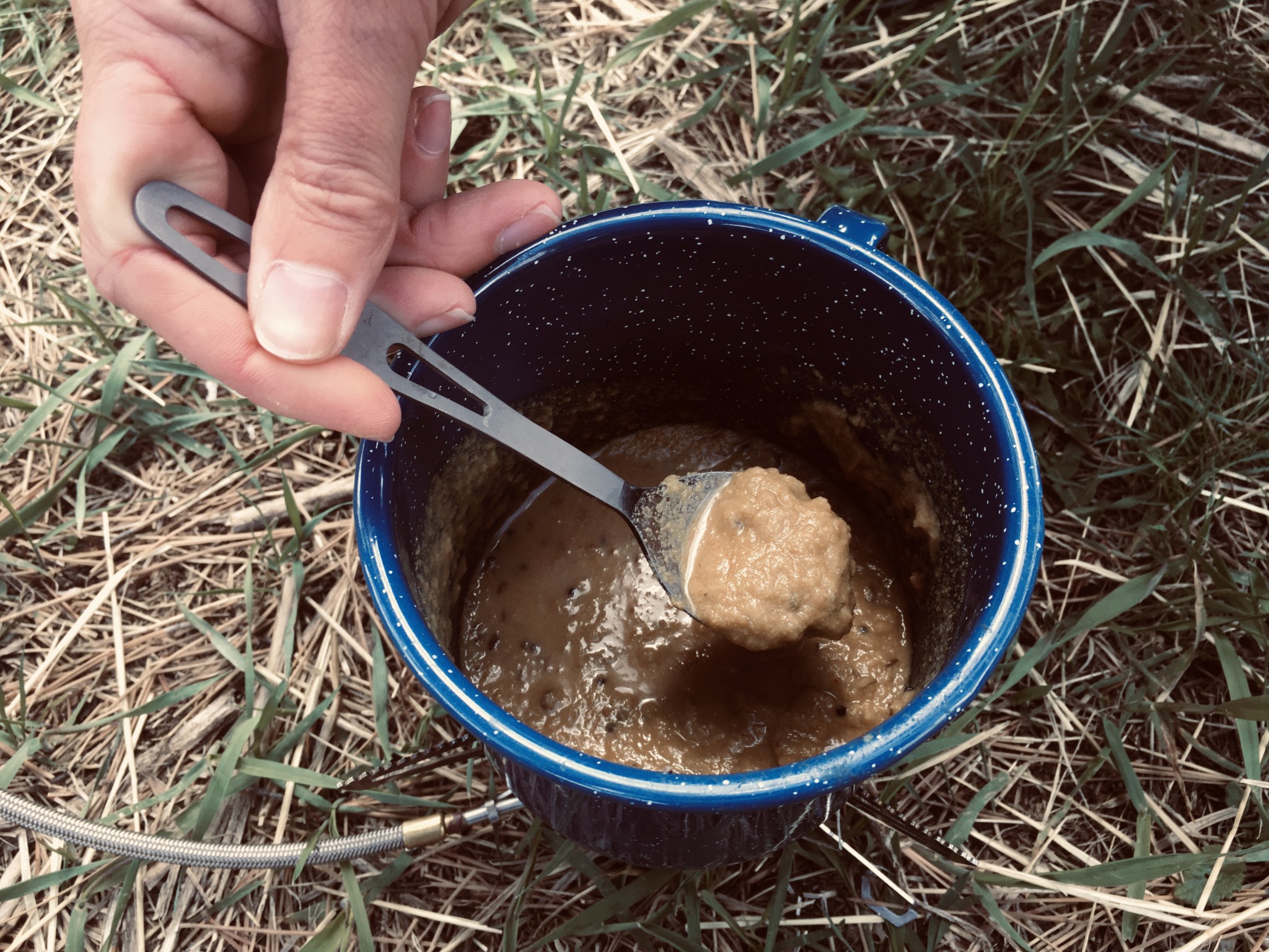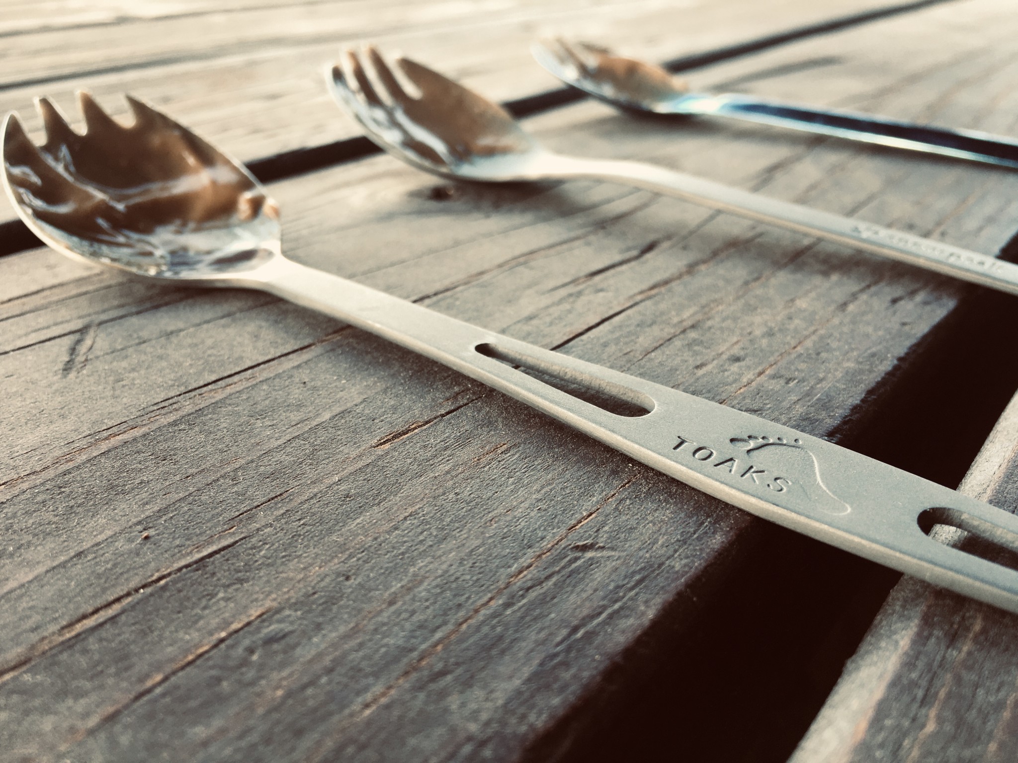 The Toaks is excellent for spreading foods like peanut butter and jelly, the prongs are more than enough to stab a thick slice of salami or hunk of cheese, and it can even slice the cheese if you are not concerned about the aesthetics of the finished product. It does not reach the bottom of taller dehydrated food bag or a Nalgene bottle but does reach the bottom of our one-liter pot. Use caution when cooking because if you are using the spork to stir the pot and rest it on the side, the spork will be too hot to handle and can burn your fingers.