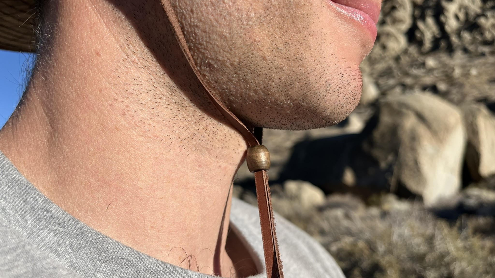 The leather cord chin strap is also very comfortable. It feels soft against the cheeks and has no sharp angles to dig into your skin. The chin strap is tightened with a lightweight wooden bead, which helps hold the hat in place. We found this leather strap and wooden bead combo significantly more comfortable than the nylon cord and plastic toggle on other hats.