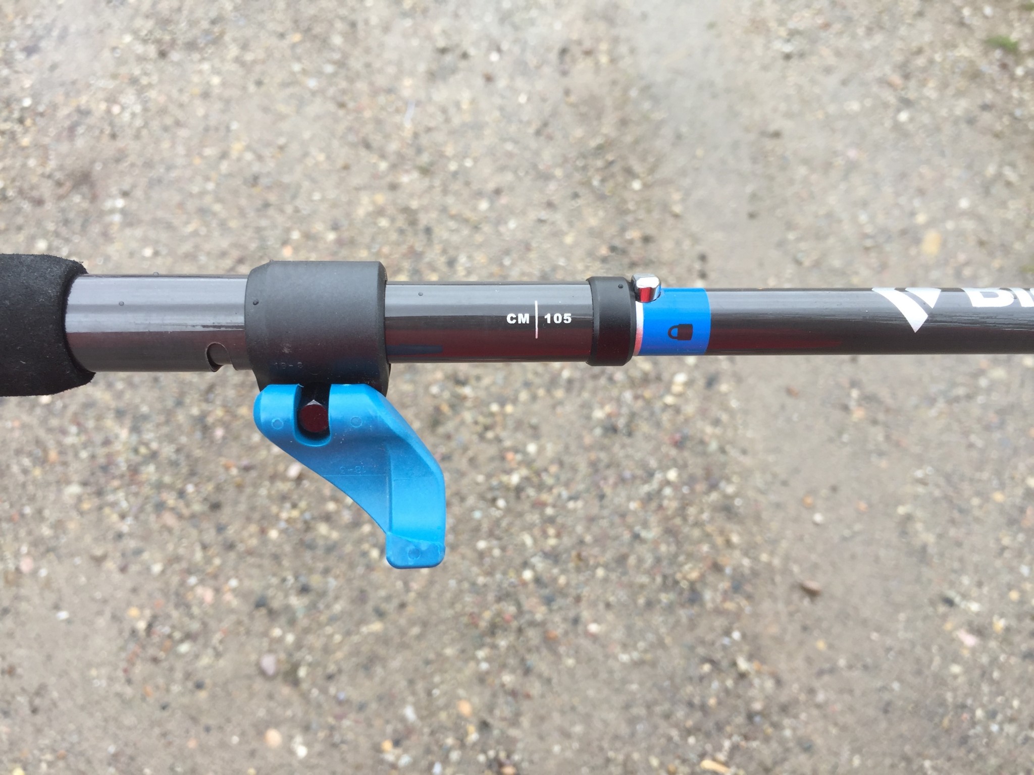 This pole locks into its extended position by simply pulling the pole sections apart. From there, a push-button snaps into place, preventing the pole from collapsing. A plastic lever lock then allows 8 inches (20cm) of length adjustment. We prefer this type of combination design for most uses, which provides a light weight with plenty of adjustment potential. For the ultralight crowd, this adjustment is unnecessarily heavy, while other users might want more adjustability — especially those newer to using trekking poles. The lever lock can be tightened with a screwdriver and works well.