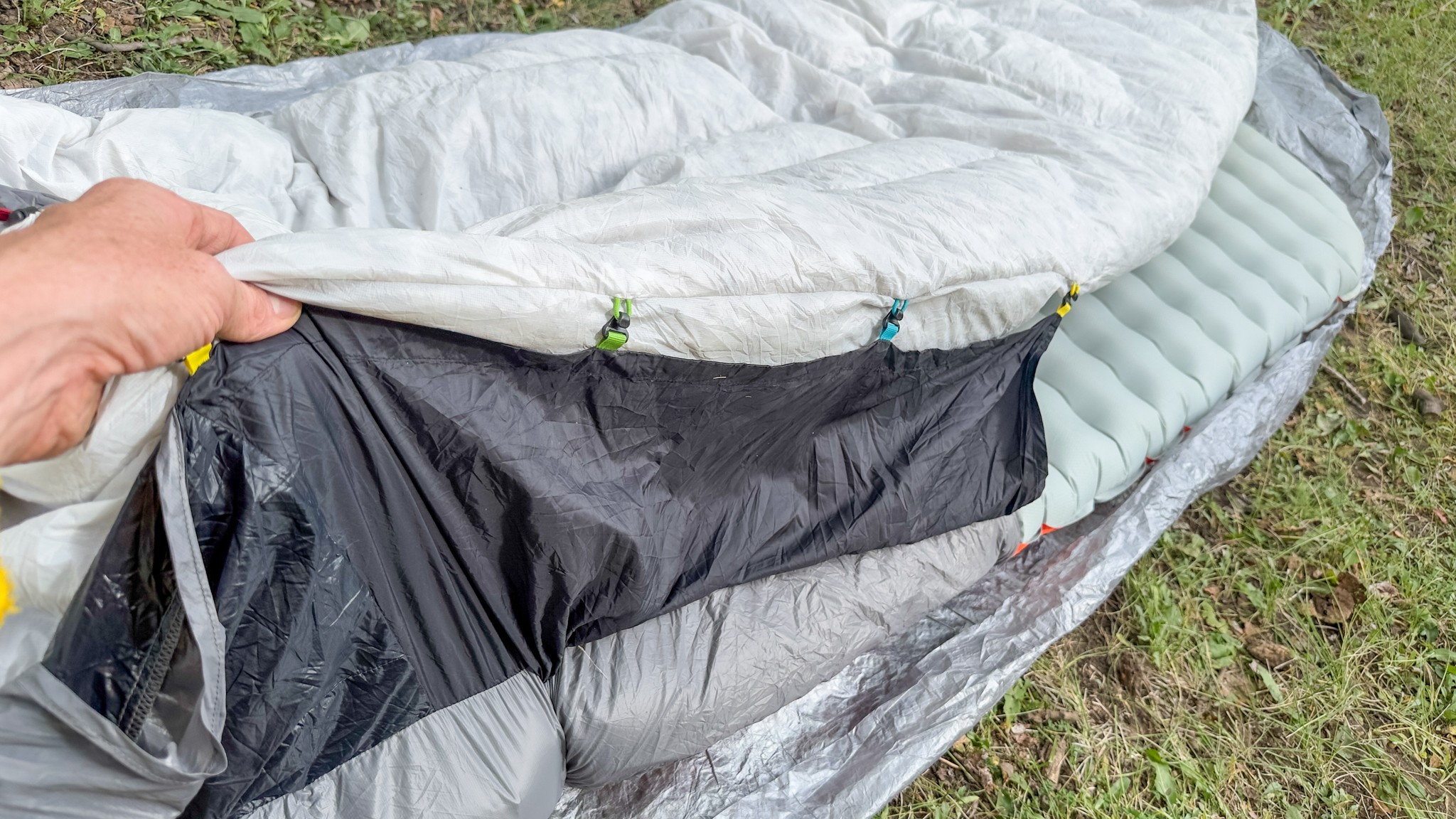 The Zenbivy Ultralight Muscovy 25, coupled with its Ultralight Sheet, is built to practically eliminate drafts from the sides, no matter how much you toss and turn through the night. Full stop: if that's your primary challenge when sleeping out in the backcountry, this is a great solution. The Ultralight Sheet works fairly cleverly: it is attached to the sides of the quilt through a series of color-coded hooks. Your sleeping pad is then pushed into the bed sheet's sleeve underneath the quilt itself.