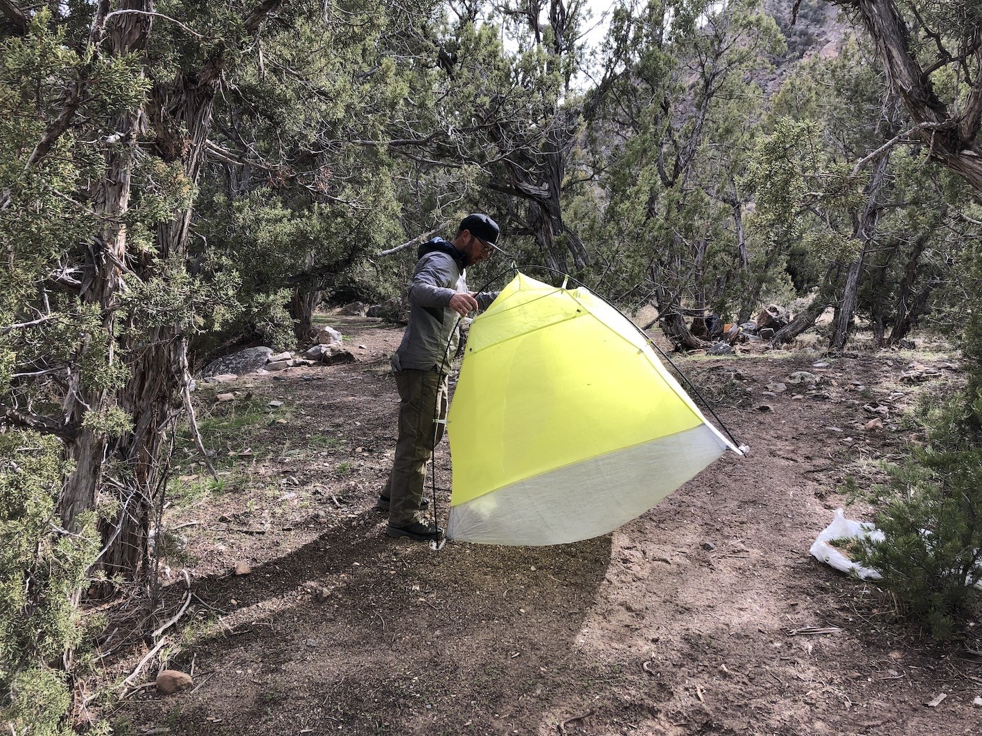 Another important point needs to be made. This tent is extremely delicate in comparison to others. Terrain that is very prickly, sticky, or rugged could puncture and tear this tent, thus, site selection becomes even more important. Plus, without a footprint, even pine cones can pierce the floor material, which is a trade-off for its lightweight design.