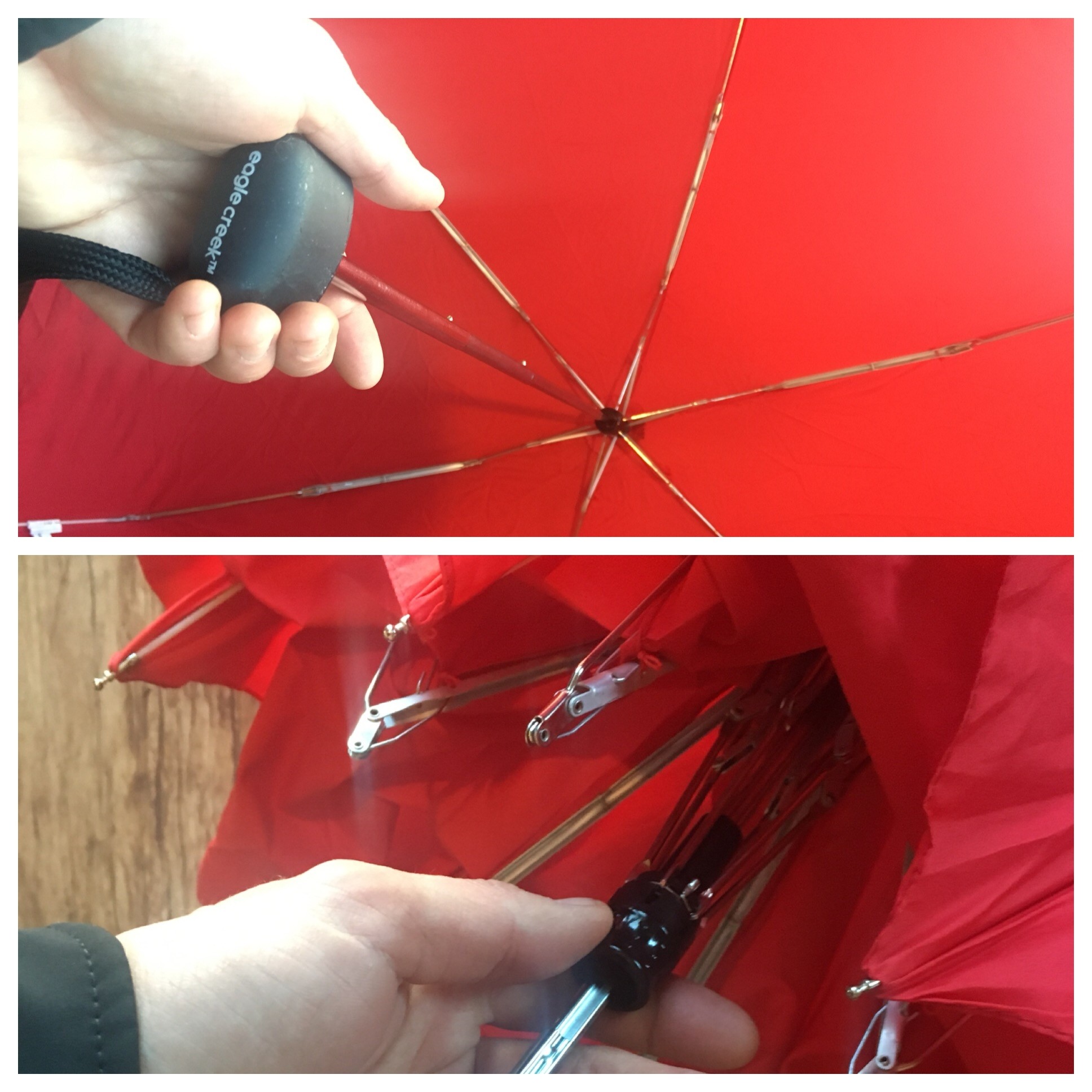 We inspected further: The Eagle Creek only has fiberglass tip segments, the rest is metal, which bends—and if it bends bad enough, it'll snap (more on this in a moment). The umbrella only has six ribs: more durable models sometimes feature 8 or even nine ribs. (Check out the Helinox and the Swing Trek for some impressive durability.)