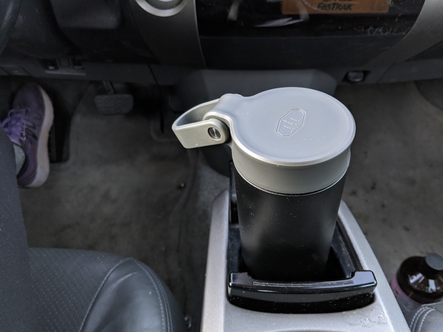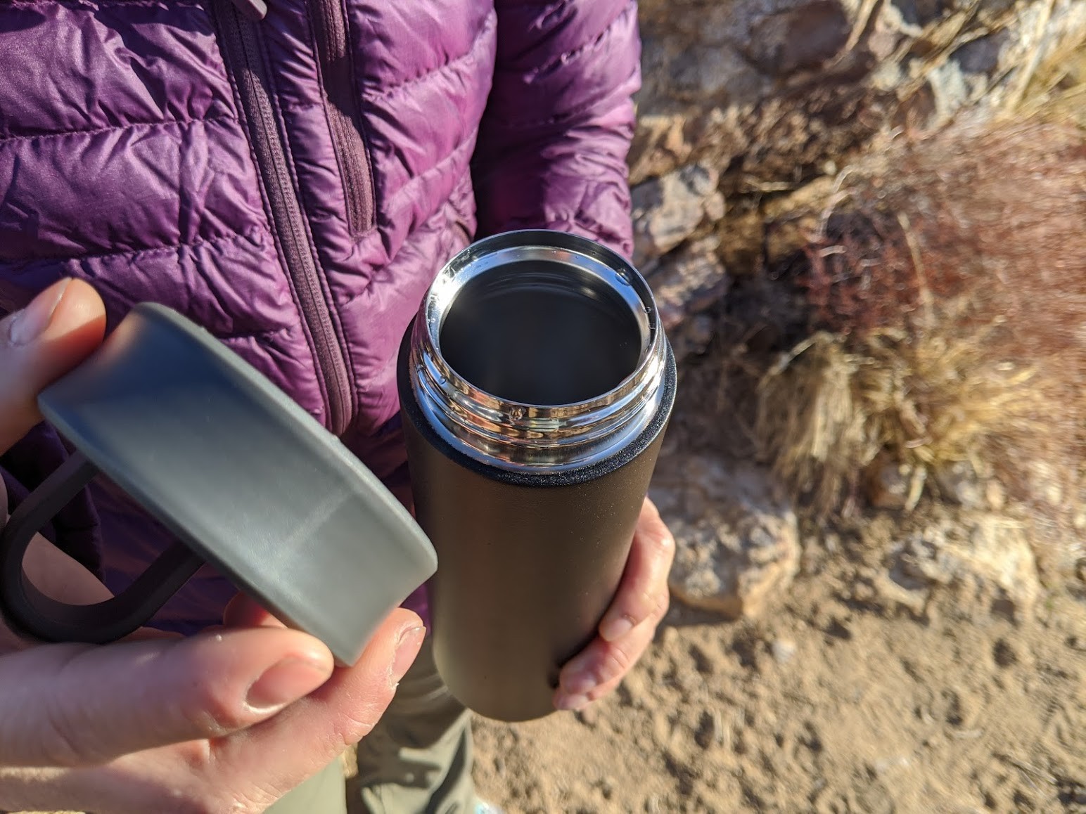 At first glance, the GSI Outdoors Microlite looks just like the many other vacuum-insulated bottles we've tested over the past few years. But, a few specific features set this bottle apart from the rest. To start, the Microlite has a silicone pad on its base, which protects it from denting and gives it a bit of friction on surfaces, reducing its chances of spilling when lightly knocked. The bottle's plastic lid has a hinged handle that can be stowed along the bottle's side when it's not in use. We liked this aspect of the carrying handle, but we found that when it was deployed, it was too small to carry comfortably unless you want to hang the bottle from a single finger. Alternatively, this handle could be used as a clip-in point for a carabiner, but we don't often find ourselves clipping our stainless steel bottles to anything.