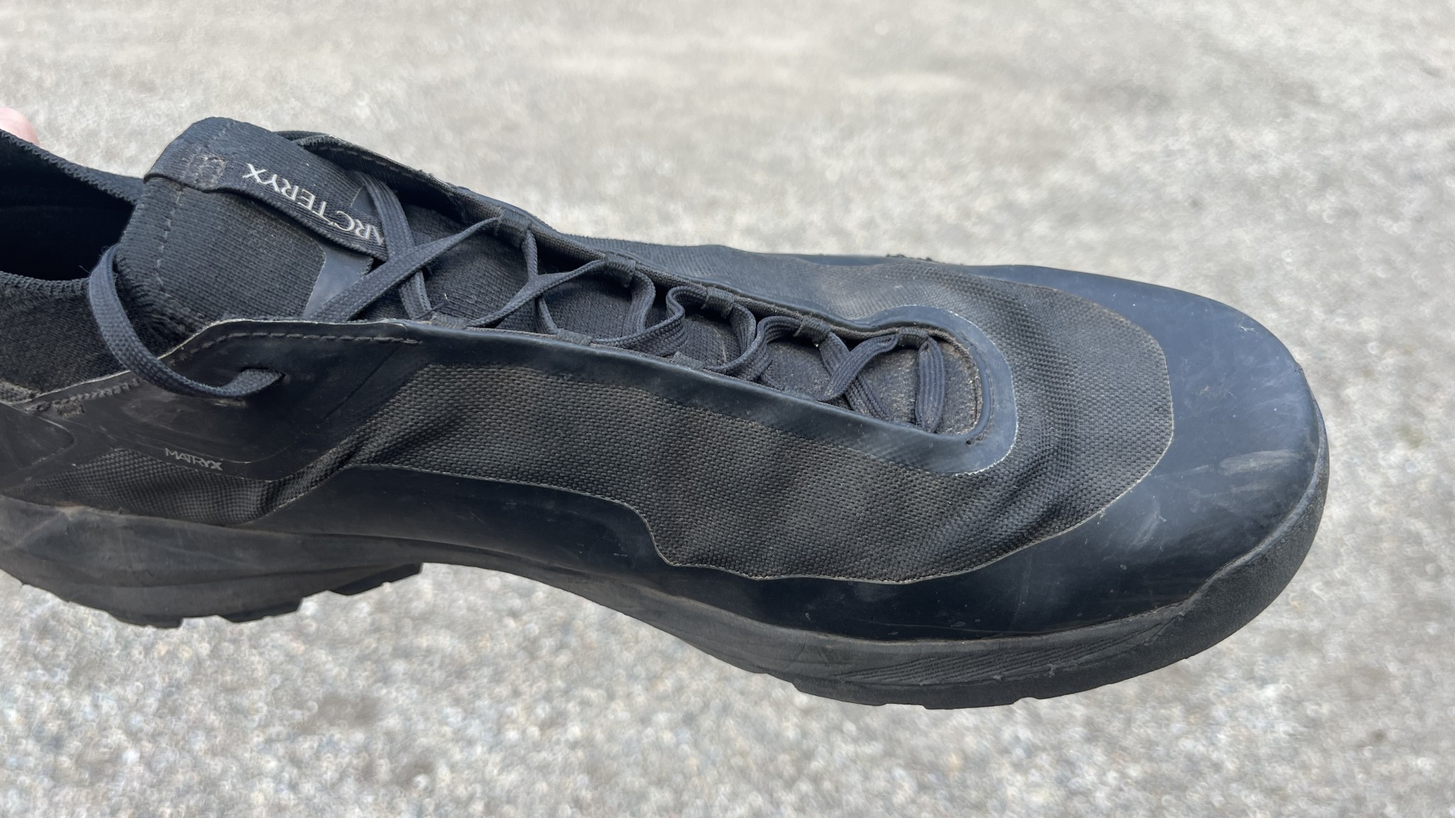 The Arc'teryx Vertex is well-built and has good construction quality. Vibram rubber lasts a long time, and the bottom of the polyester upper is protected by a thin rubber rand that extends around the circumference of the shoe. The stretchy polyester components of the upper are resistant to wear and tear, and the lace pattern distributes tension evenly, preventing too much pulling in any one place.