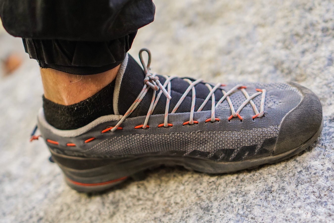 The laces on the TX2 go all the way down the toe so you can get a tight fit when it's time for some technical edging. In a men's size 9.5, our lead tester's usual street shoe size, his toe sits perfectly at the end of the shoe for edging, but the shoe isn't so tight that it makes hiking uncomfortable. Maybe the leather uppers on the TX4 stretches more than the Synthetic TX2, whatever the case, TX2 edges better than the TX4, and almost as well as our Top Pick for climbing, the Five Ten Guide Tennie.