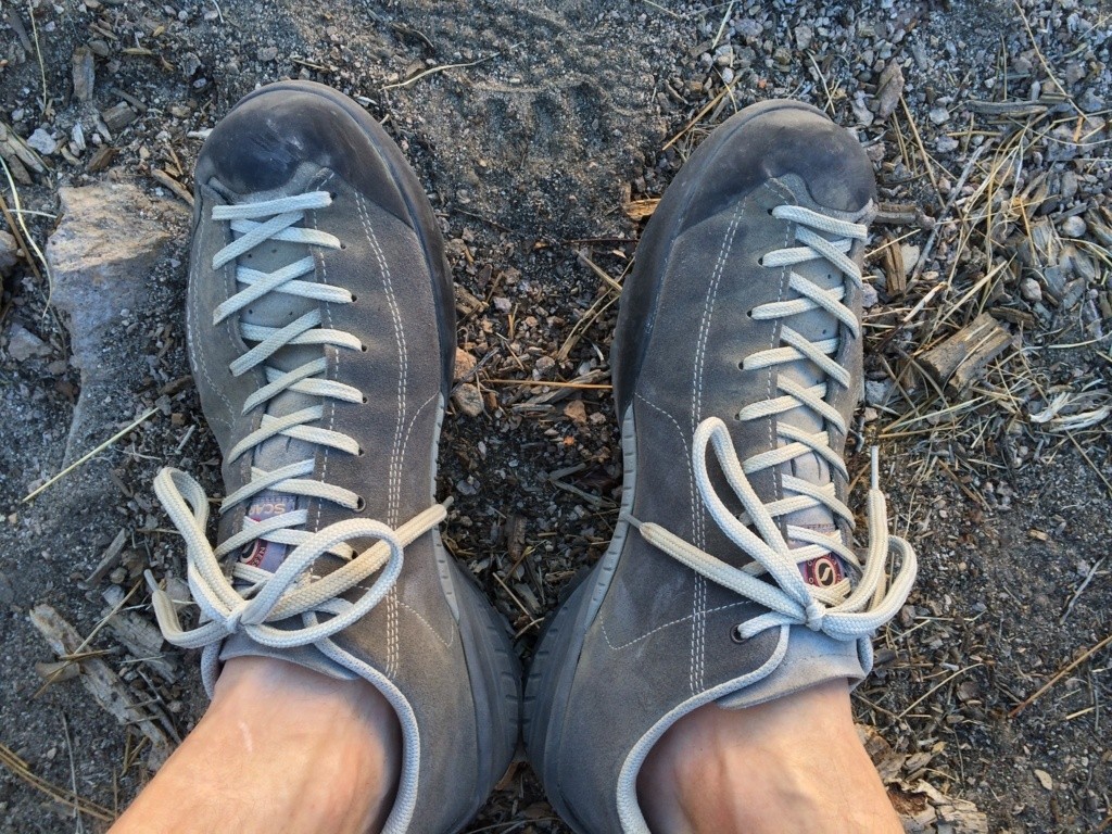 The Scarpa Mojito is a minimalist shoe with little midsole cushioning. Some folks quite like this; it keeps your foot close to the ground and paired up with a durable but supple suede leather upper, it provides a flexible, unrestrictive fit. The leather upper is known to stretch and mold to your foot over time and folks with both narrow and wide feet can achieve a comfortable fit. The leather tongue has a few little holes for air flow, but in summer you'll want to switch to your flip flops once you get to the crag.