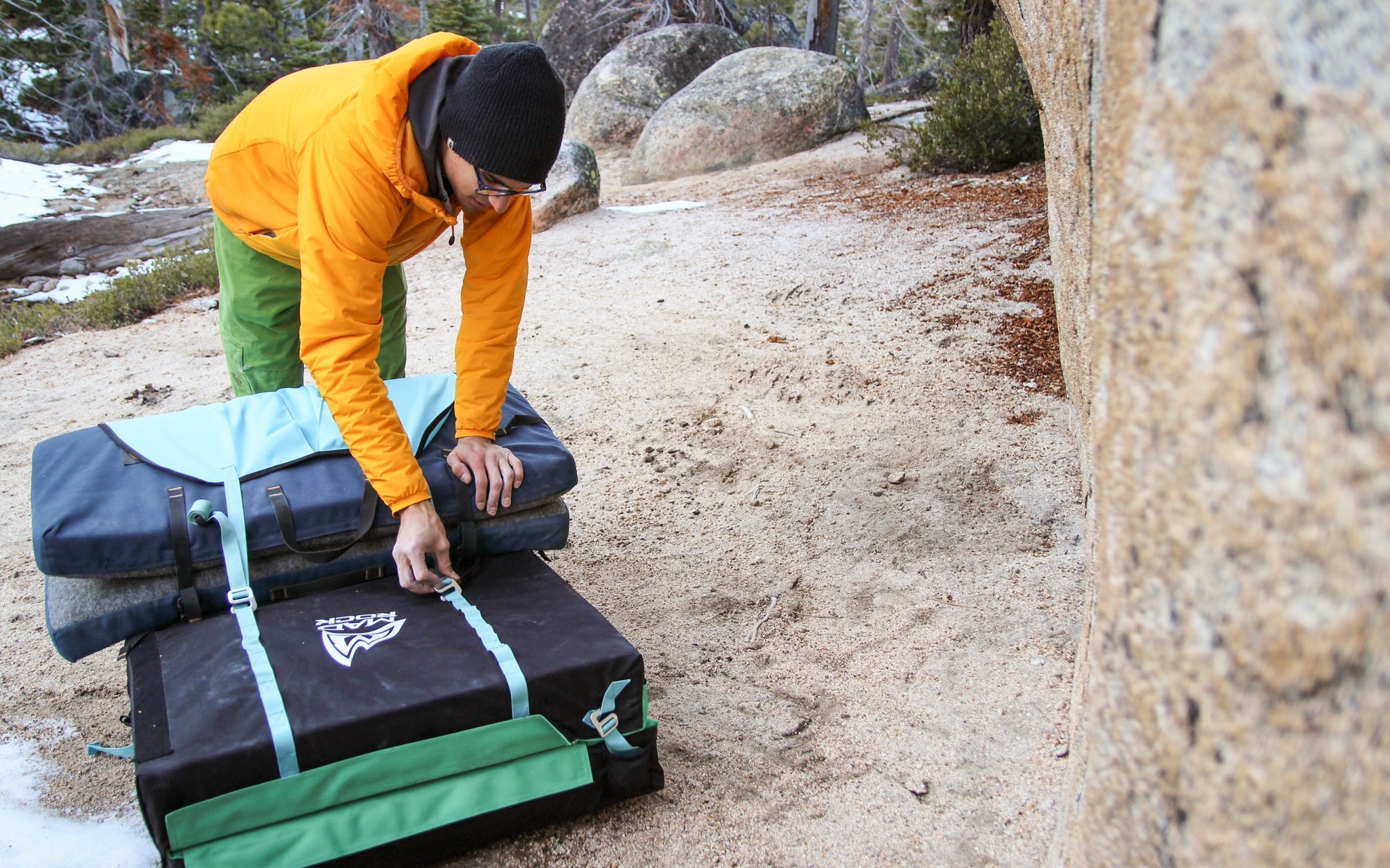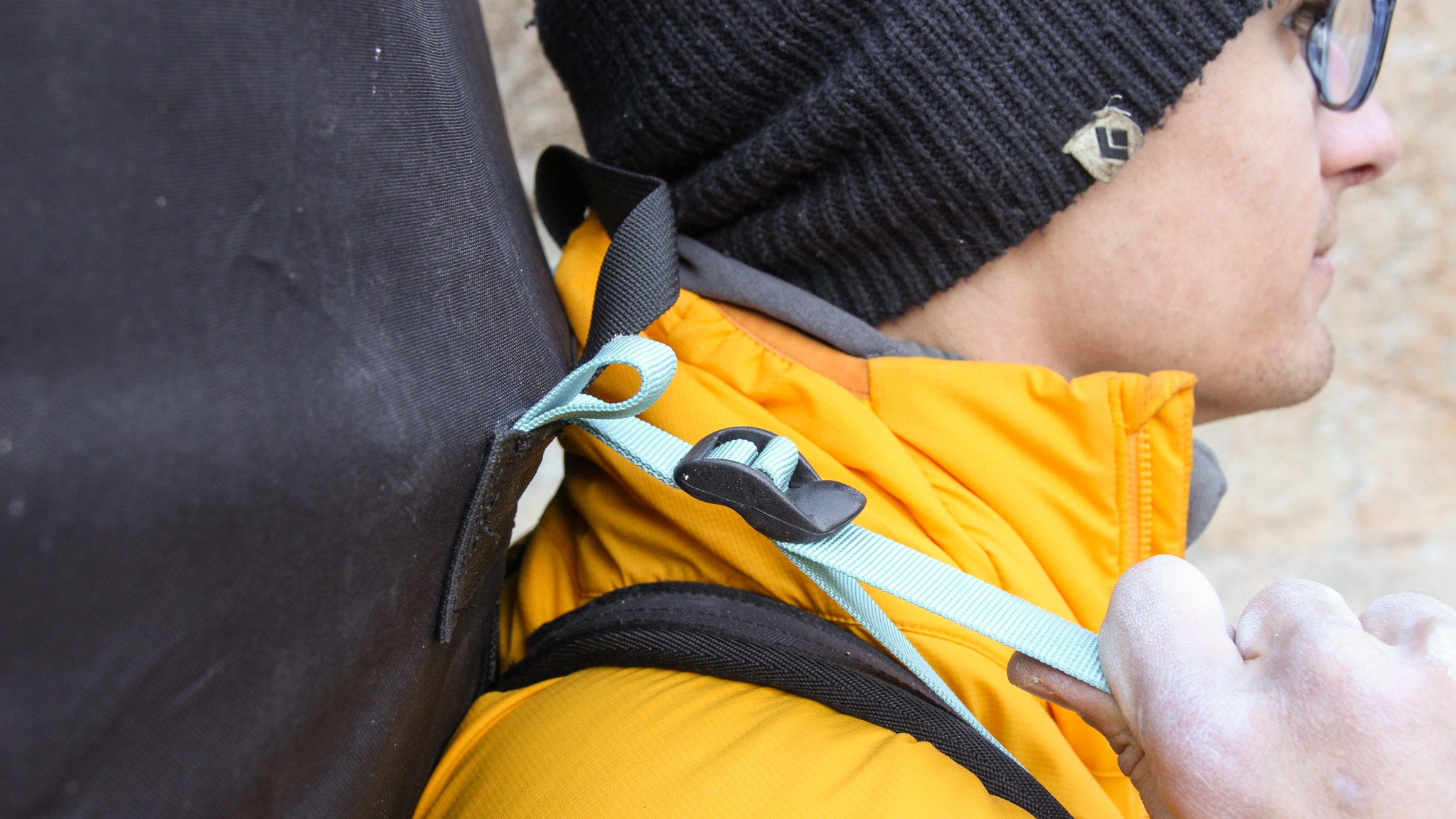 The Duo is one of the most highly featured crash pads that we tested. In addition to its standout suspension and pad attachment system, there are two daisy chains on the back for clipping gear. Testers liked the integrated water bottle pouch, which enables you to stay hydrated on the approach without having to take the pad off.