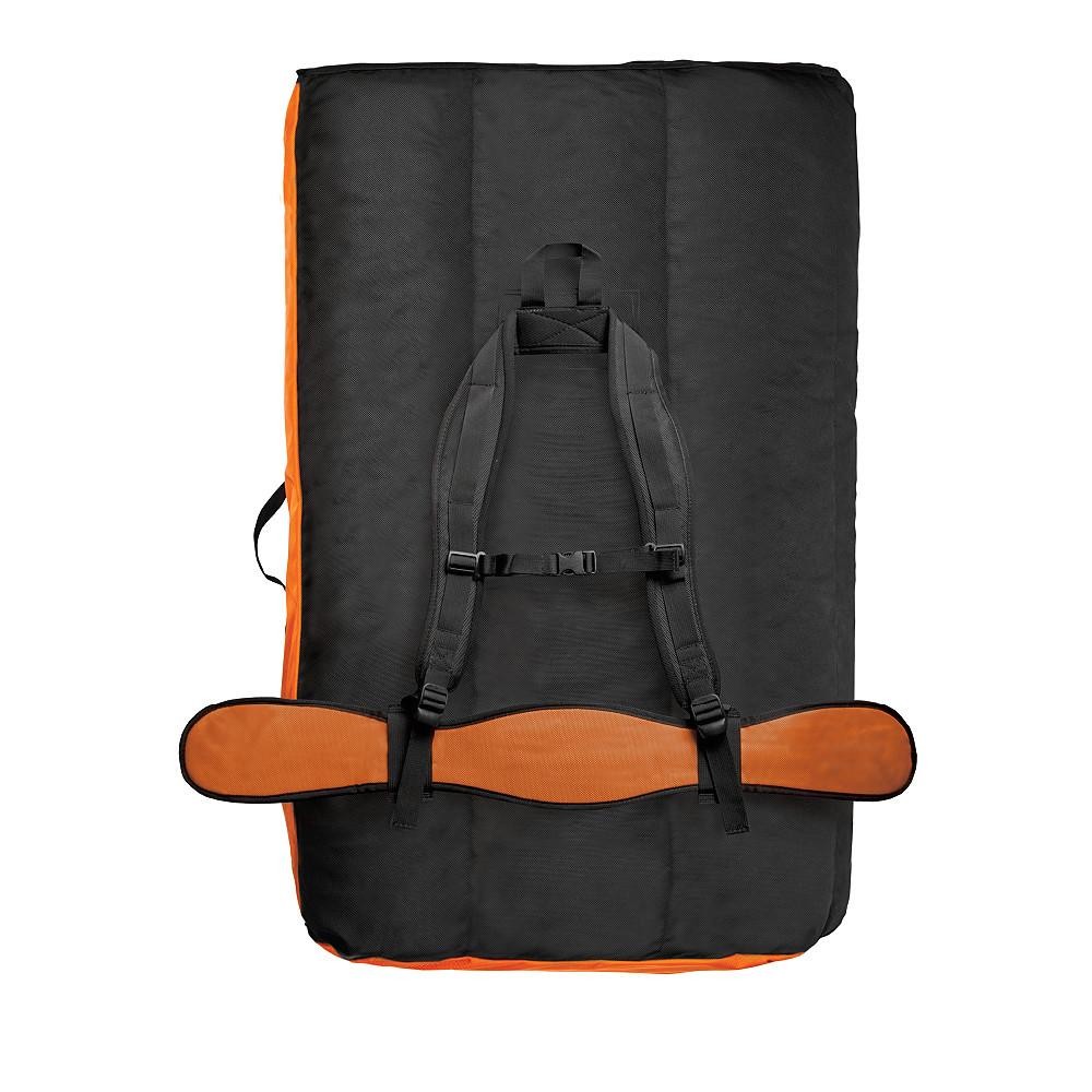 Packing gear is easy and secure with ample room inside as well as side and bottom flaps to hold the stuff in. The suspension system is solidly attached with comfortable shoulder straps, chest strap, waist belt and the extremely useful handle between the shoulder straps for loading the pad onto your back in pack-mode. There is also daisy chain webbing on the back of the pad for quick attachments of the straps as well as any other gear. The 55" x 35" x 4" size is a fair amount above the average size of about 48" x 36" x 4" but it still feels like a smaller size pad while being carried. It is heavy relative to comparably sized pads. The weight can be worth it when you consider it is the best pad for conforming to uneven landing zones, its carrying capabilities, and the dense recycled foam. In our opinion, these benefits are worth the extra poundage and make the Mad Rock R3 an overall winner.