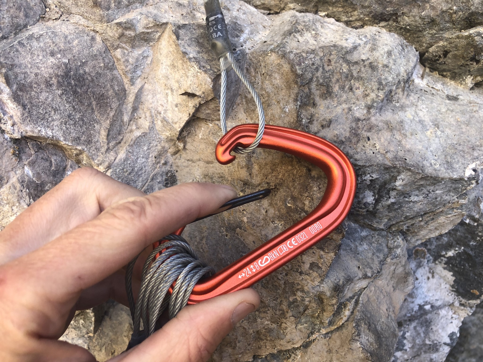 The Hotwire is by no means the easiest carabiner for unclipping. The principal downside of a traditional wiregate carabiner is that there is a notch and hook on the nose for the gate to slot into. This notch and hook can work to catch the rope when trying to unclip it while seconding, or hook on bolt hangers, slings, or stopper cables while trying to unclip the carabiner from them. The notch and hook on the Hotwire is larger and deeper than most other competitors, meaning that compared to the competition, this negative attribute is actually enhanced. Added to the mix is the fact that the nose angle actually bends back on itself, creating a vertical wall, so to speak, preventing the rope from simply sliding out on its own if the gate is open. While these issues can easily be worked around with a little extra care or fiddling, they could also be addressed with better design.