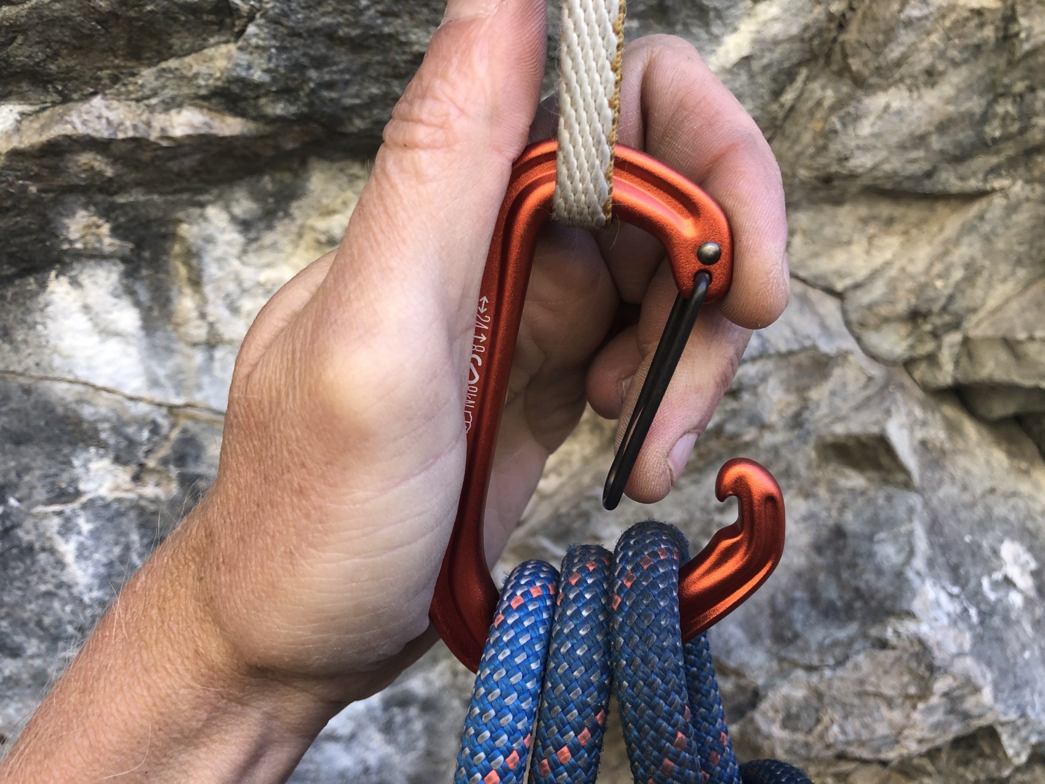 The wire gate of this carabiner is made of thicker gauge wire that weighs more than the lighter weight gates more commonly found on many of its competitors, and is molded in an absolute straight line, rather than incorporating any bend to aid with clipping. We also feel like the gate spring is noticeably stiffer than most other wiregates, which means that more effort is needed to push the rope through. Once you do, that stiff spring snaps closed with authority! The gate angles outward as it descends, coaxing the rope into the basket if it is pushed downward, but the gate itself is too tight for the rope to do all of the work, you certainly need to push it on through.