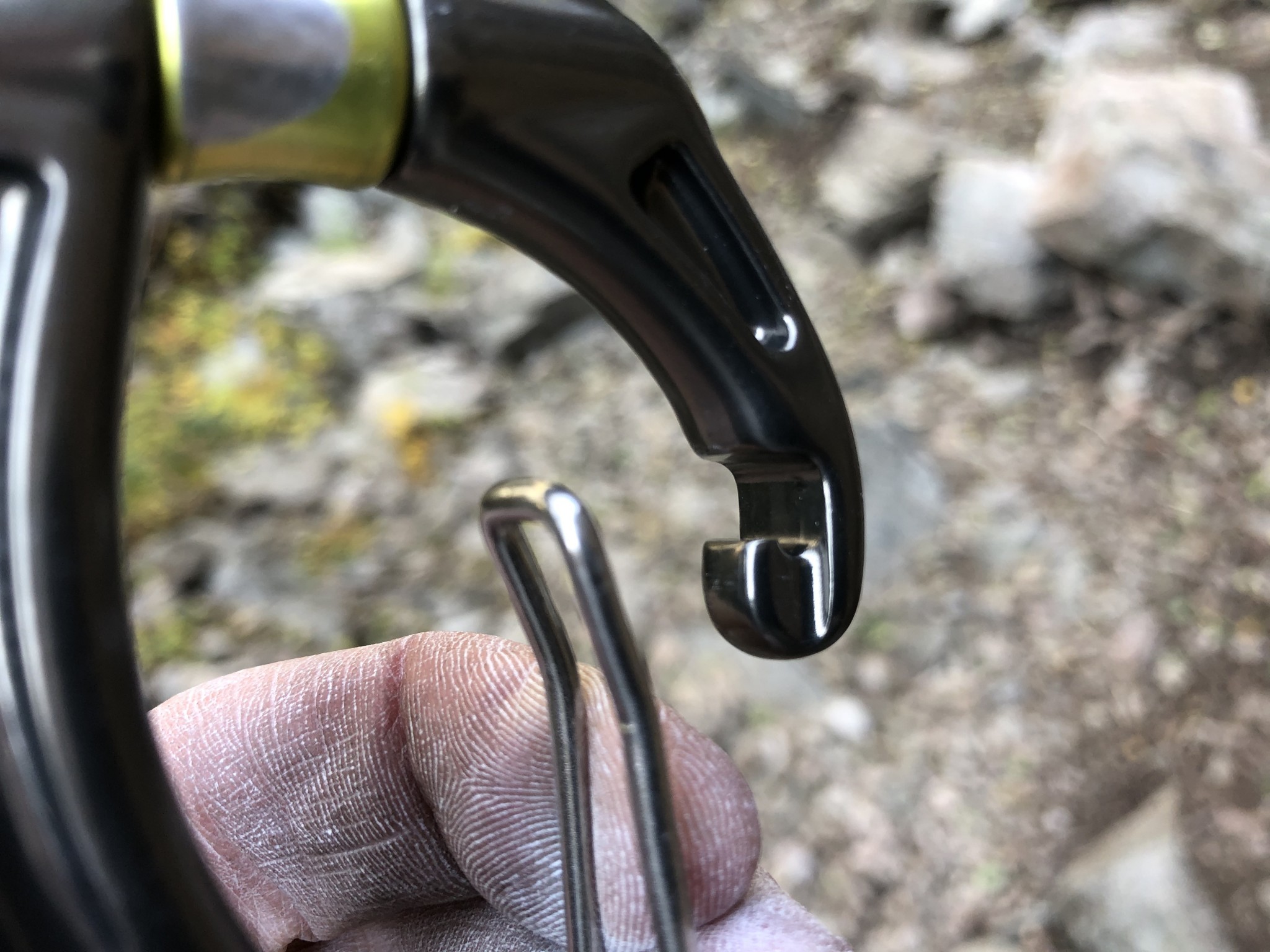 The clearance of the gate is measured at 24mm, which is roughly in the middle of the field. The basket is made wider by a bend in the spine, and is overall very deep. While we found that it doesn't necessarily handle three knots or ropes fitting into the basket at the same time very well, it also isn't designed to be used as an anchor 'biner, so this test wasn't very fitting. Suffice to say, the gate clearance is plenty enough to use it effectively.