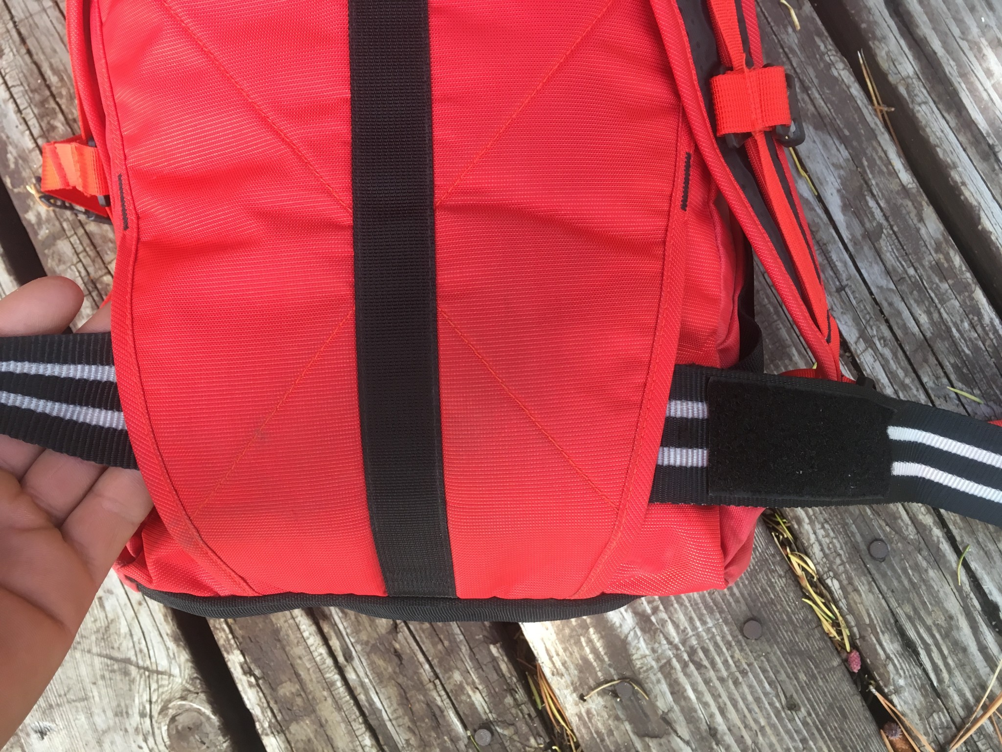The removable hip belt threads through the back panel and is held in place with velcro. It's the easiest to remove and reattach of all the packs in our test. The sternum strap buckle is an emergency whistle, a simple and multifunctional feature that we wish was on every pack.