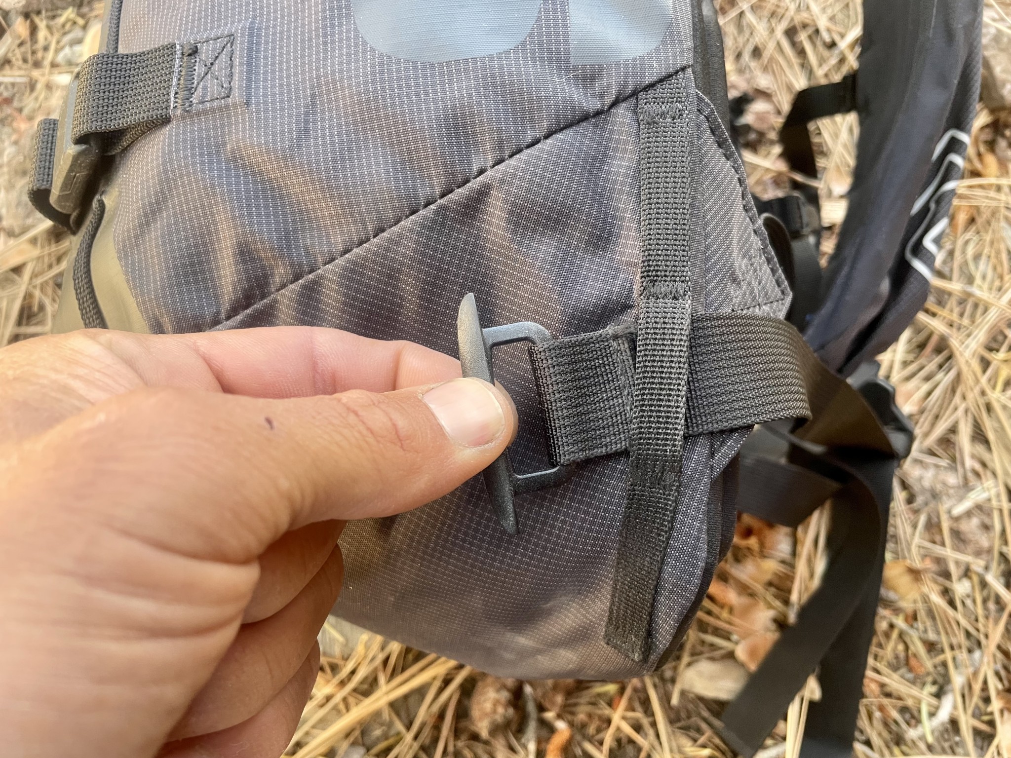 There is no whistle on the sternum strap buckle. As mentioned above, the hip belt is removable. Without the included accessories, the Scram is streamlined, and we think it could easily slip through a thicket of manzanita or slide alder. This bag has no hauling-specific features, and the grab loop between the two shoulder straps is weirdly small.