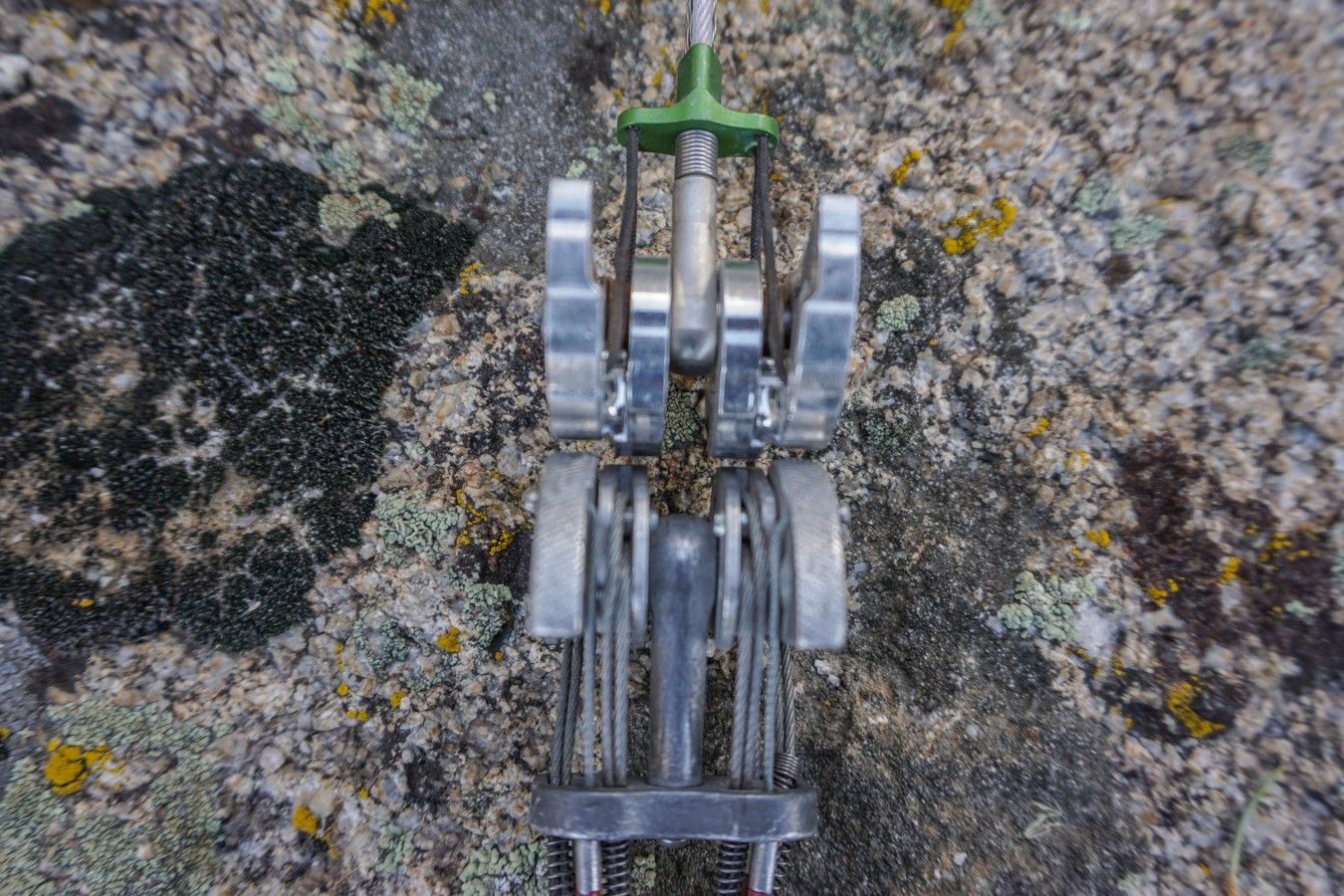 The stems on these cams are a flexible, stacked cable design, where the two outside cables that come in contact with the rock are sheathed in plastic.
