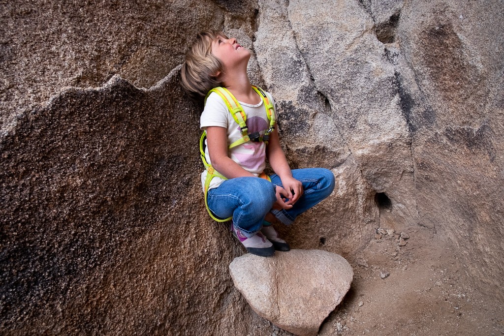 We love how easy it is to get on and adjusted quickly and how the front buckle holds everything together (including the shoulder straps) until the kids are ready to tie in. The two buckle tightening system is easy and saves having to fiddle much with the harness. The major drawback of this harness is the fact that the padding is stiff and is relatively uncomfortable for both hanging in and for approaching the wall or playing at the base.
