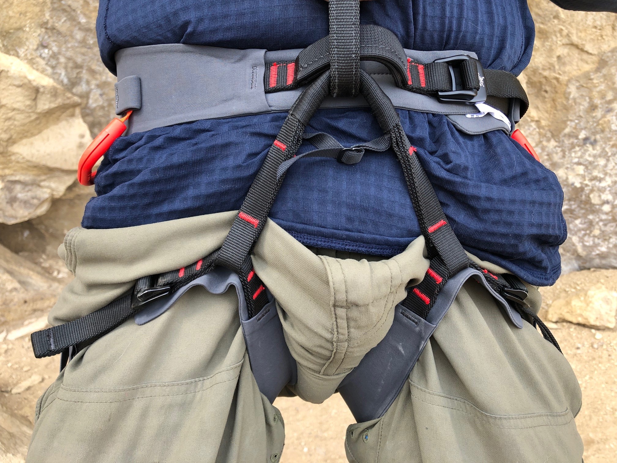 We feel like the super fat waist belt does an excellent job of spreading out our weight comfortably, and we love how it doesn't ride up and put pressure on our kidneys. To some degree, we think this design helps us stay more upright when free-hanging. However, we also feel that the leg loops bite into the hamstrings and inside leg more than perhaps any other harness. While the middle of the leg loops are super fat, where they wrap around the inside of the leg, they taper to a thin, roughly 1-inch wide, strip. At this point, the loops have the thickness of a piece of webbing, with no padding, and to us, they just feel like a single strip of webbing biting into our legs. We notice this the moment we sit down into our free-hanging test and have verified it repeatedly. If not for this one design aspect, this harness surely would rank much higher in our overall scoring, but as it is, we feel it is no better than average.