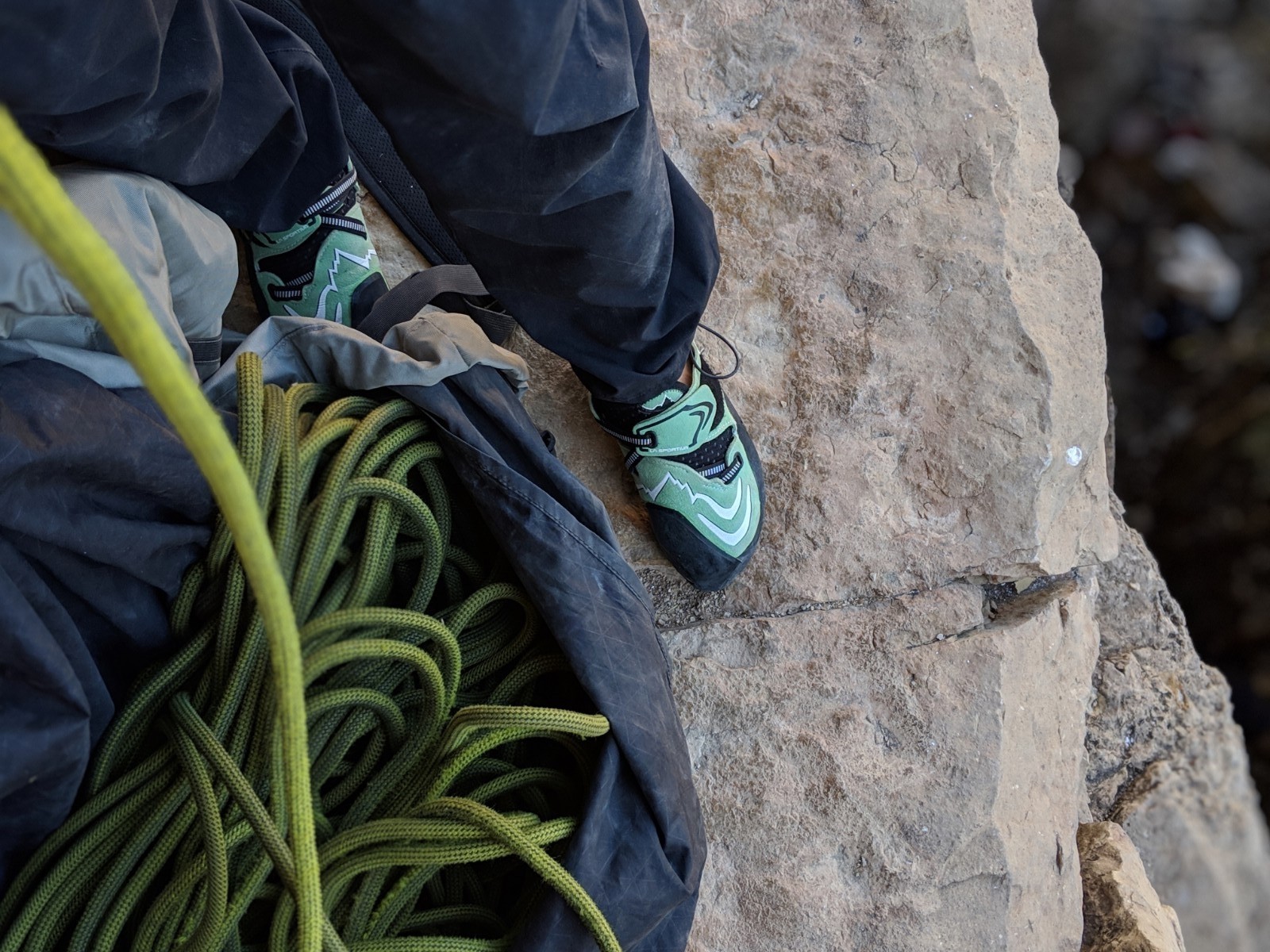 La Sportiva's Fast Lacing System makes the Futura one of the quickest pairs to get on and off. This technology consists of a thin nylon strap that weaves across the top of the foot and is secured by a bit of Velcro; this makes the shoes easy to tighten or loosen, and even easier to slip on and off in between burns.