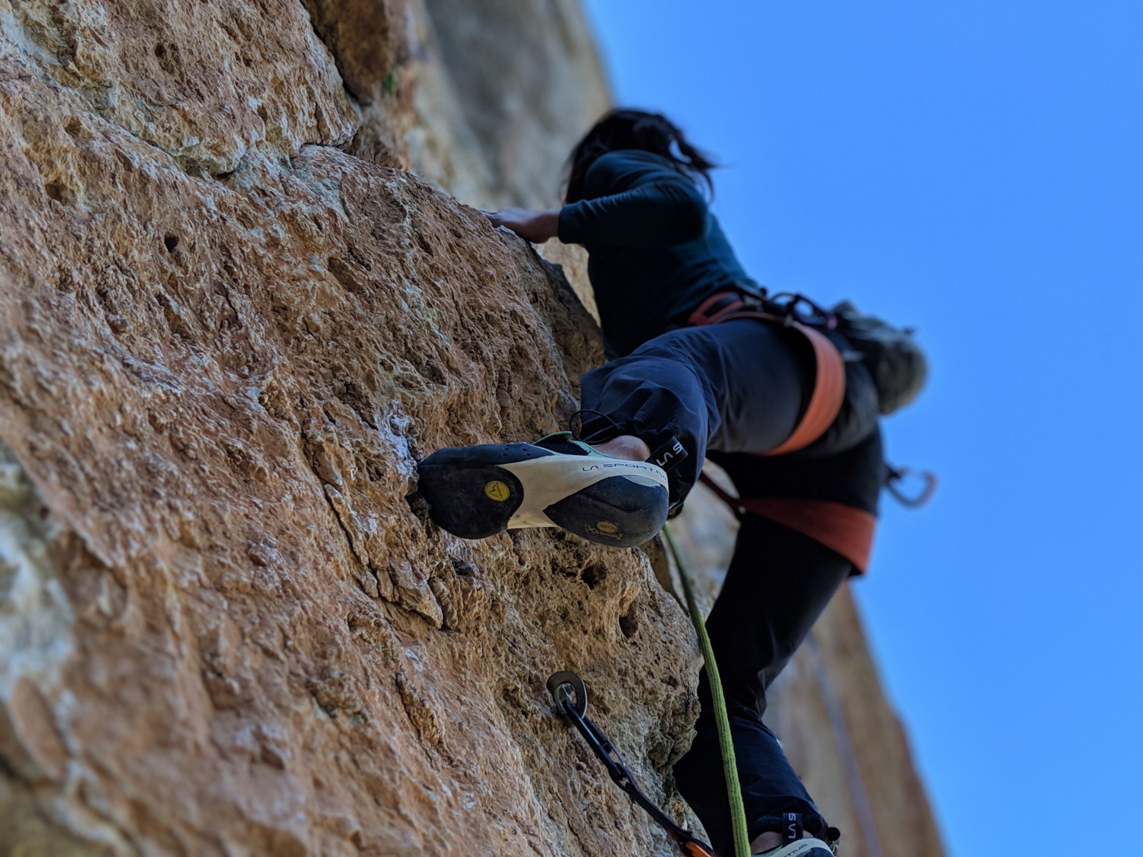 We loved the Futura for steep, pocketed climbing. The toe box fits into small pockets with ease, and the heel is precise and tight-fitting enough for the occasional heel hook. The No-Edge technology allows the Futura to toe into the shallowest of pockets with ease. For steep, pocketed limestone, the Futuras were on par with other top Sportiva models we've tested.