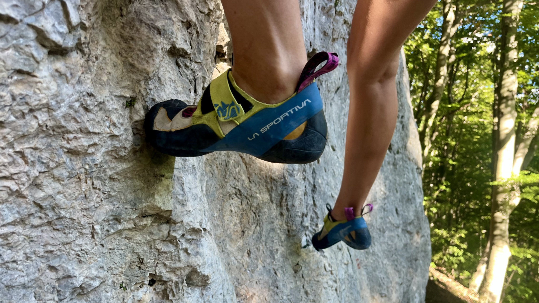 The Skwama was one of our favorite shoes for pulling on steep, pocketed limestone. Because the shoe is soft and flexible, you can really feel the hold and pull with your toes. It practically molds around holds when you're toe-hooking or heel-hooking, giving you that locked-in, suction-cup feel. Their stickiness and soft midsole also allow them to glide into smears and tiny divots with surprising confidence. The big rubber patch over the toe lets you really pull with your foot on overhangs or volumes without worrying about slipping, and the snug heel design grabs holds so you can crank body tension moves.