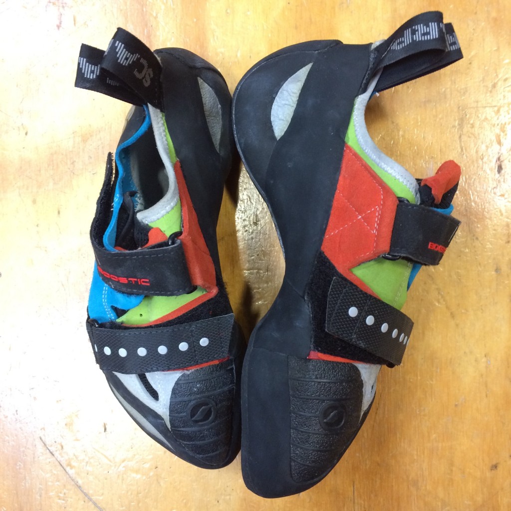 The Boostic thrives in the beyond-vertical world of hard sport climbing and bouldering. It is a specialty climbing shoe that will enable serious grade pushing, at the expense of comfort and wearability. The very tapered toe box of the Boostic provides little extra room for the arching of your toes and the sole and upper are both extremely stiff. These design features make it difficult to get the shoe on and can make the Boostic very painful to wear. The Velcro closures make a snug fit even tighter and provide a locked-in feel that provides a sense of security and confidence moving on thin features. The rubber at the top of toe the makes hooking a piece of cake. The heel is very stiff and can make heel hooks feel a little blind, and the V-Tensioned Rand is so stiff it can be hard to smear in them.
