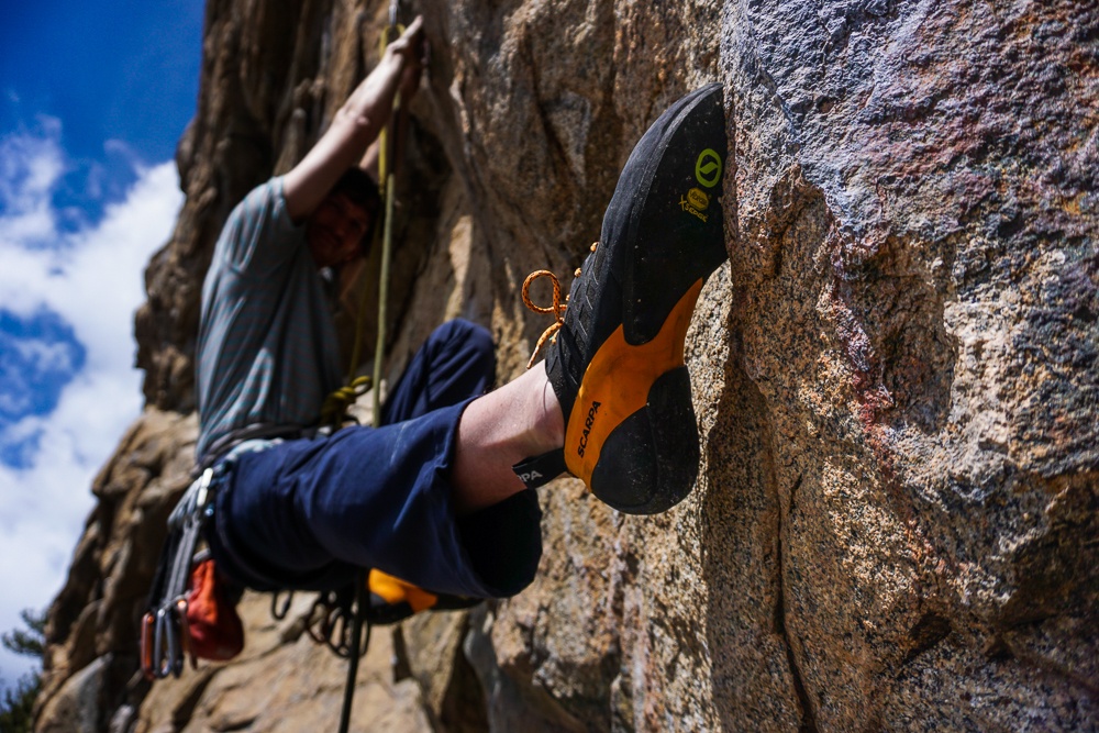 The Instinct Lace is fitted with 3.5 mm of Vibram XS Edge rubber at the forefoot that supplies plenty of support for edging on the smallest features. Its moderate downturn puts your foot in a curled posture that focuses extra power through your toe on both the slabs and steeps. The most significant difference between this shoe and similar models from La Sportiva is the bendy Flexion midsole and heel. This supple material supplies extra sensitivity for the back of your foot, but it reduces overall support and may accelerate foot fatigue during long, taxing leads.