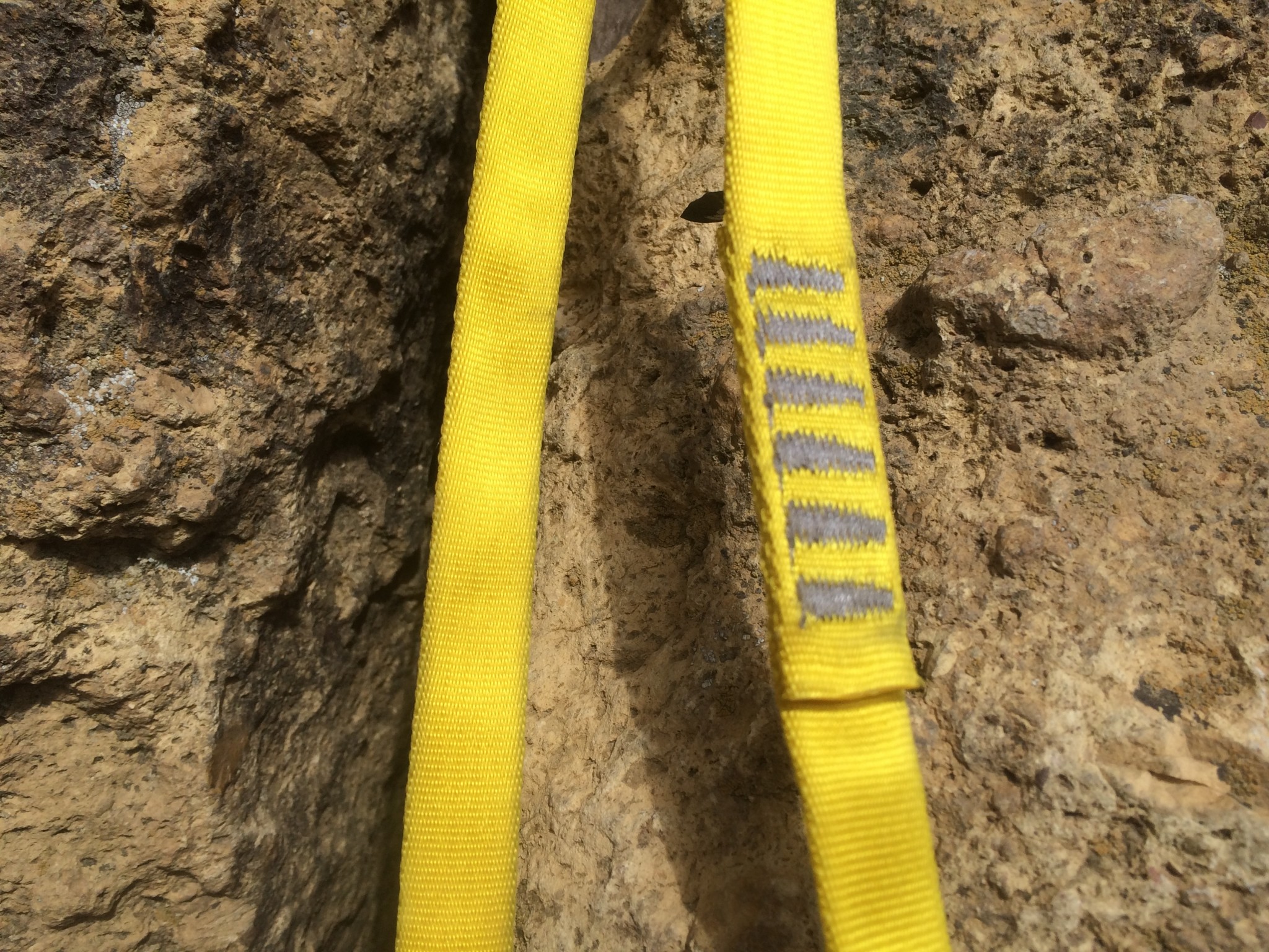 Another great advantage of using a fat Nylon sling is that you can easily rack gear on it over your shoulder, and it doesn't bite into your neck as you second the pitch or make your way down off a huge mountain, a quality that isn't true for super skinny slings. On the downside, the bar tacking is relatively large, with obvious tabs hanging off each end that can catch up when running over a biner.