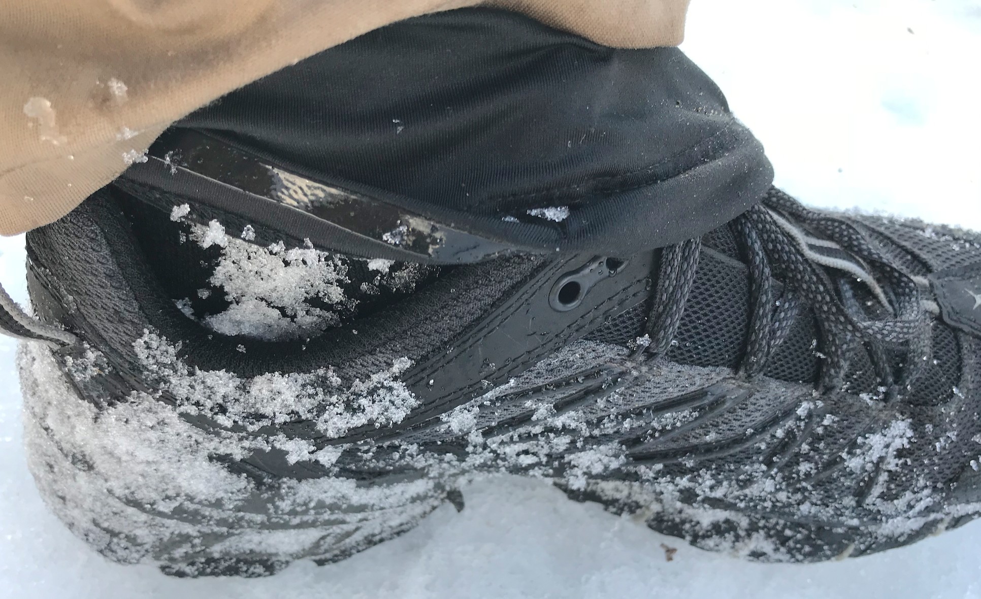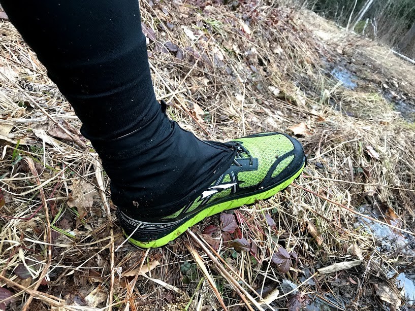 Once they are over your ankle, just fasten the lace hook and stretch them over your footwear. They are longer than the Outdoor Research Overdrive Wrap and Salomon Trail, but we were still surprised by how they fit over different types of shoes.