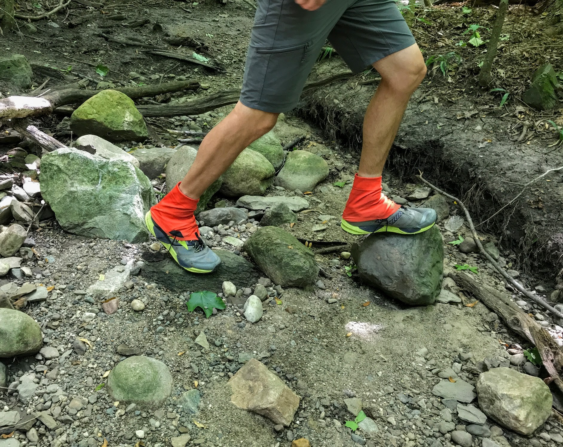 Once you have the startup work done, these gaiters are simple to attach. Slide them up over your foot, put your shoes on, attach the front lace hook and the rear velcro, and position the two segments of the instep strap. Right and left aren't officially marked on this model like on some other gaiters, but you should have the instep toggles on the outside of your feet.
