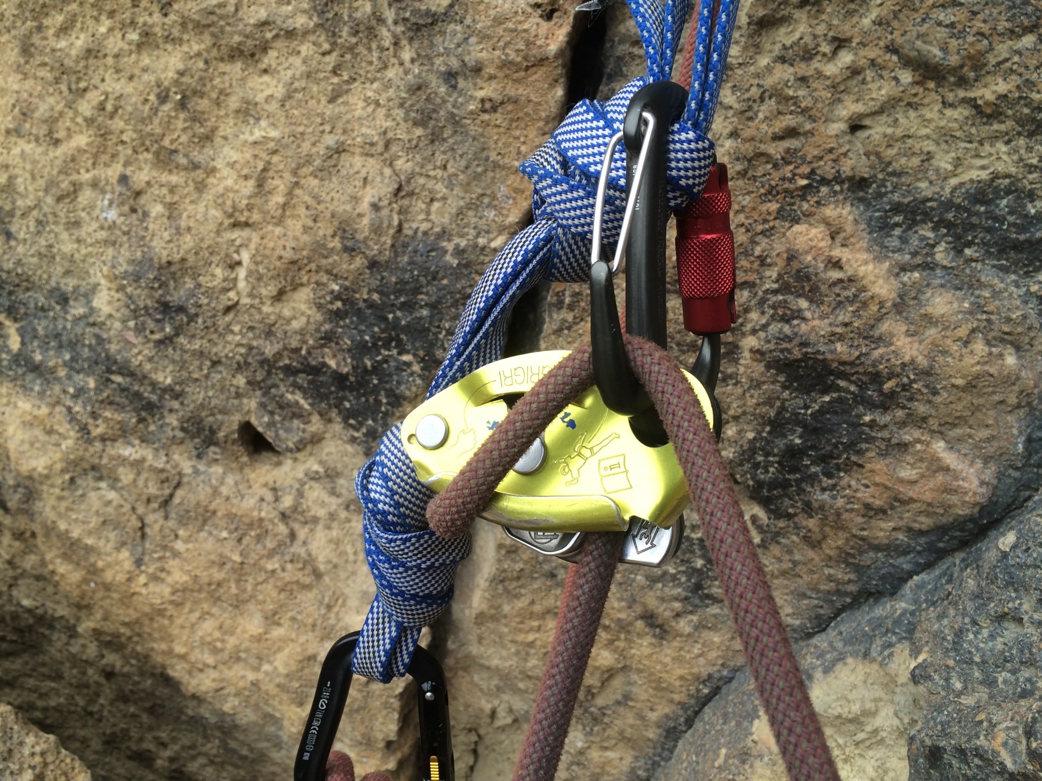 We want to give Petzl credit where it is due for inventing a locker that provides a solution to a problem: inadequate braking control when using thin or new ropes with a GriGri, or for very light belayers or kids who struggle to lower heavier partners in control. By looping the brake hand rope through the friction spur, one can add significant amounts of friction, making lowering very easy to control. We should point out that this locker is designed to be used with a GriGri, and with only a single rope, and so have found its use to be unfortunately limited to the exact situations described above. We will admit that we were initially a bit confused as to how to use this braking spur feature, and so scoured the internet for ideas on how other people are using it, which we then tested ourselves. Here's how some of these uses went for us: