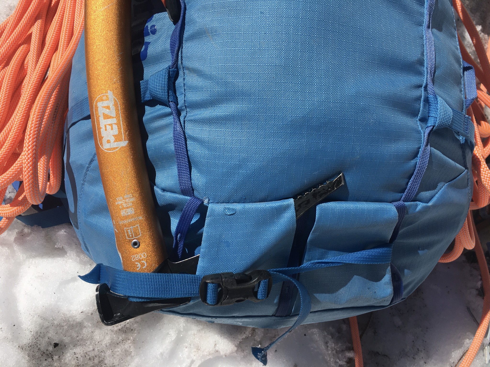 The only other standout feature was the ice axe attachment. While we like the sleeves that hold the picks of the tools securely, the strap that secures the head of the tools in place is one that we really don't like (and yet several manufacturers insist on using). One single clip secures both ice tools, which means you cannot easily deploy just one tool. One of our favorite maneuvers to keep us moving through complex terrain is to be able to reach behind us, grab the head of our tool, and deploy one tool to assist with French technique on some sudden, surprisingly firm snow. With separate attachments, we can usually deploy a single tool like a quickdraw, making us feel pretty rad and ninja-like.