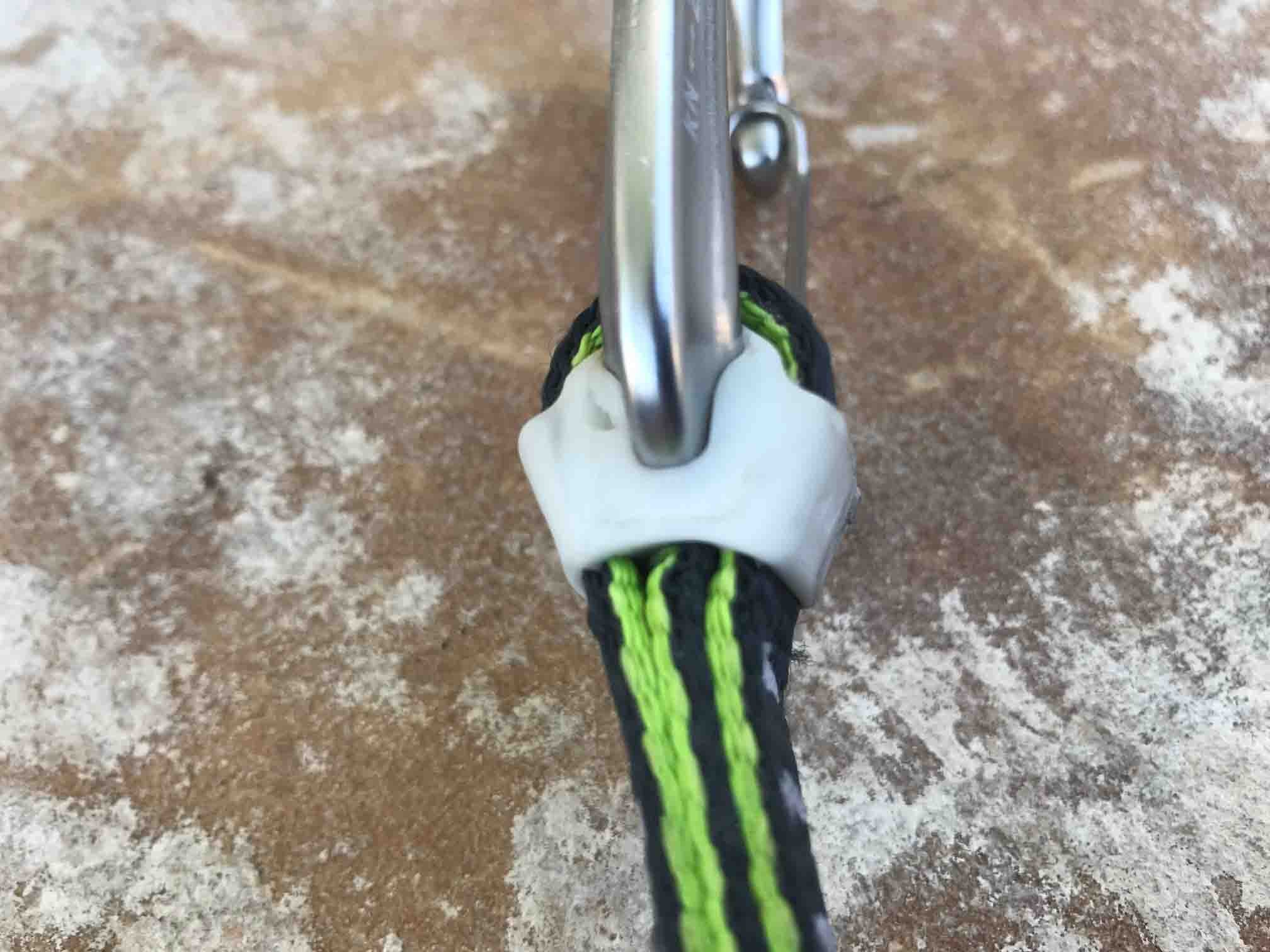 That said, we aren't big fans of the exterior positioner, which CAMP calls the “Karstop Evo” (hence the KS in the name). It's a combo exterior/interior piece of rubber that is sewn into the bottom of the dogbone. It eliminates any user error issues, but also makes it impossible to replace if it wears out or tears. It also doesn't protect the bottom sewn loop, which other exterior positioners do, and the whole rig is slightly on the bulky side. The positives with this design are that they allow for more movement of the carabiner while still keeping it oriented correctly when catching a fall.