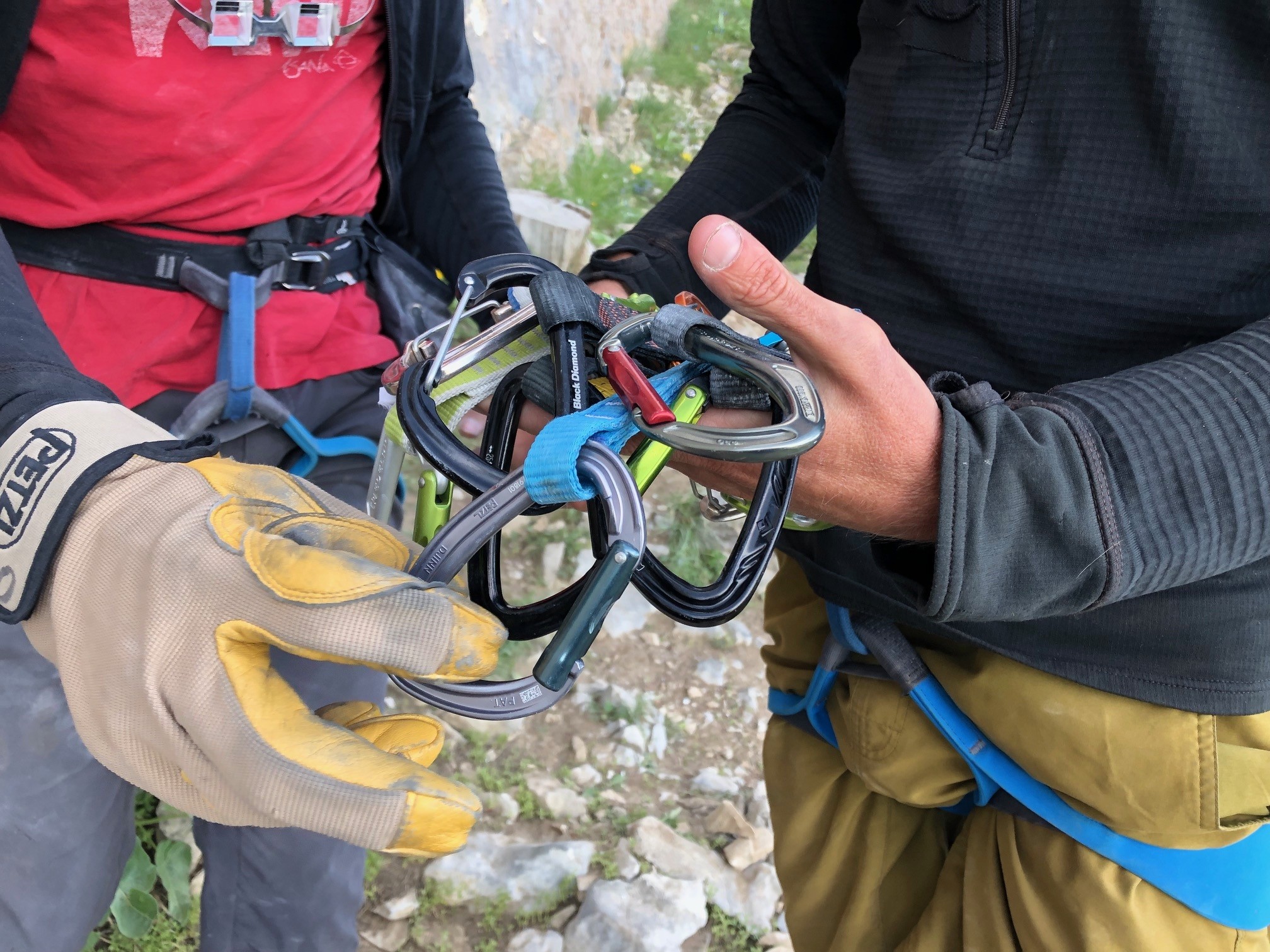 The carabiners on this model are some of the largest that we've tested. The bent gate opening is 27mm wide, and our testers with larger hands found that the Djinn Axess clipped very easily. The wide gate opening also makes it easy to place a clove hitch or other rope anchor points in the bottom carabiner at the top of a climb.