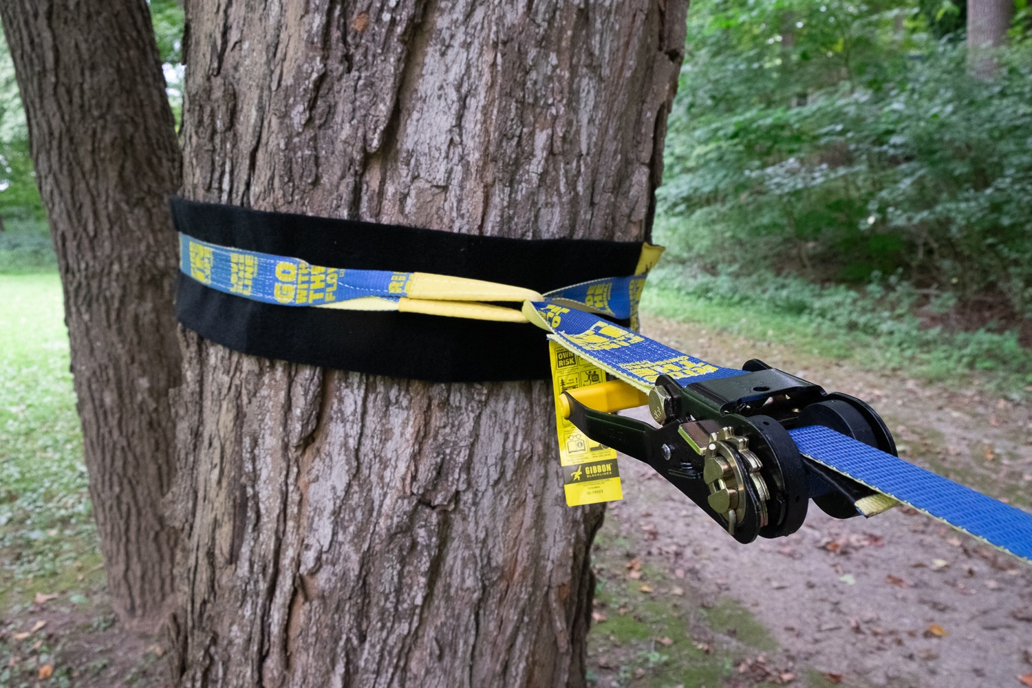 The two-sided webbing has one blue side and one yellow side, so that, when you pull it tight to tension, you can easily see if there are any twists in the line. The kit we tested also had two tree protection pads that were easy-to-use but could have used more length, which left often us borrowing pads from other kits. Gibbon does sell tree protection separately and we recommend adding a couple of them to the cart at checkout!