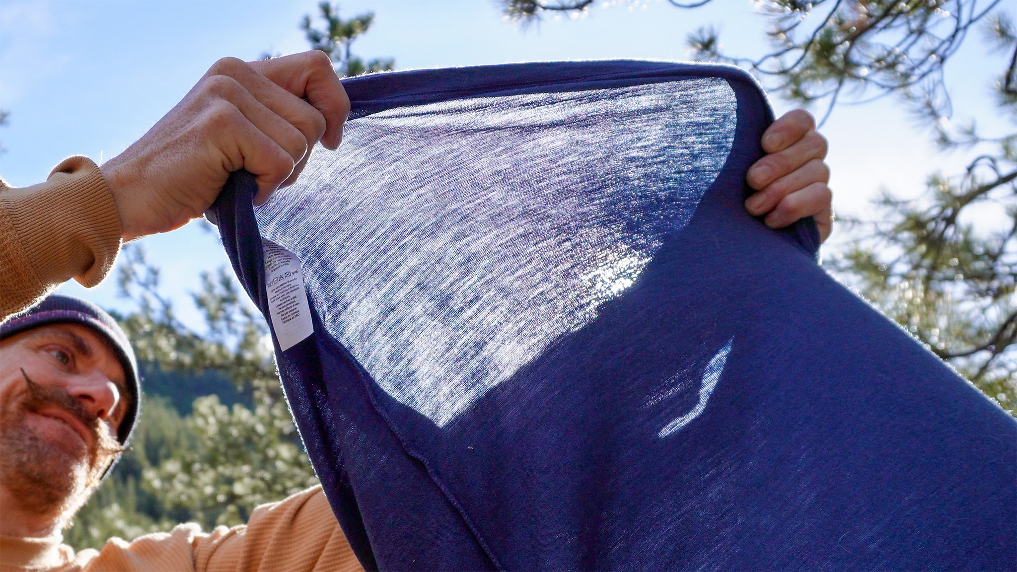 The smooth, thin fabric of the Merino.tech Crew works best as a slim-fitting, next-to-skin layer. This top just isn't durable enough as an outer layer by itself and may look a little too technical even in casual situations. There are no frills — no zipper, buttons, or thumb loops. The back features a drop hem, with a shirt length of 29 inches for a size Large.