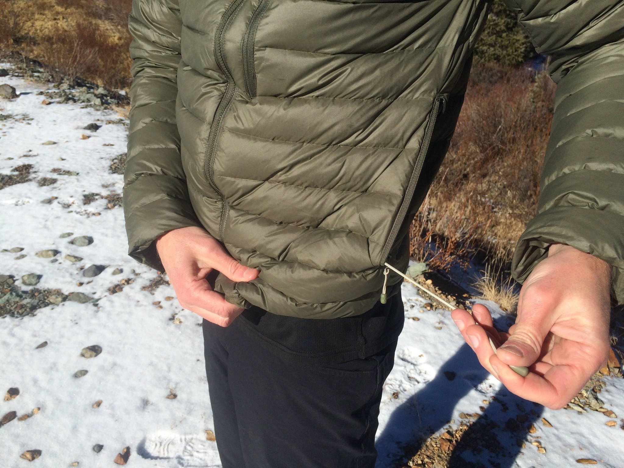 We like that this jacket stuffs into its own hand pocket that has a zipper with an easy to grab pull tab, but lament that the stuffed package remains rather large, not unlike the Patagonia Down Sweater Hoody. It scored lower than the similarly compressed Outdoor Research Transcendent Hoody because it didn't have a clip-in loop on the outside once stuffed, a minor inconvenience, and also leaves a hem drawcord tab exposed. While it was certainly more easily compressible than any of the jackets that didn't stuff into a pocket, such as the Columbia Outdry Ex Gold, we only gave it 6 out of 10 for this metric.