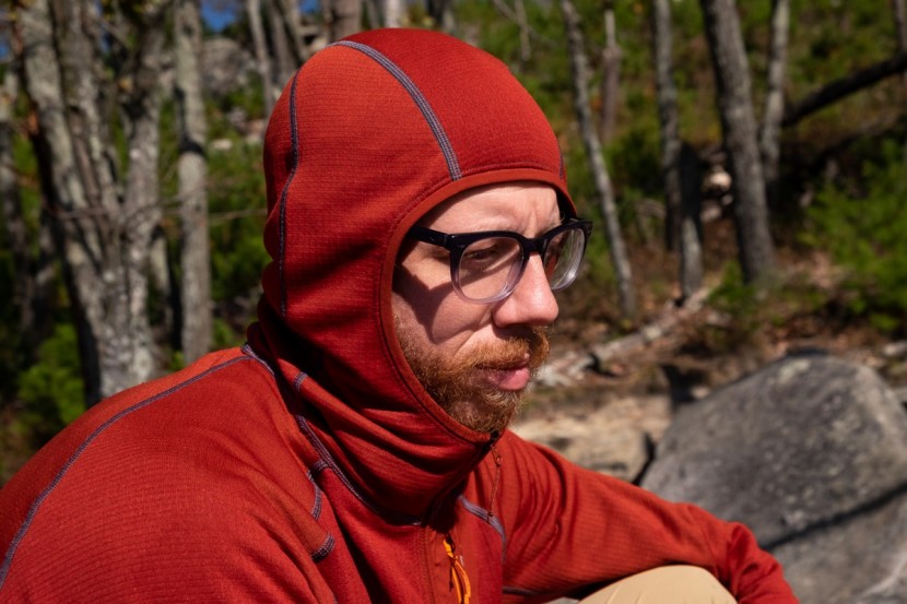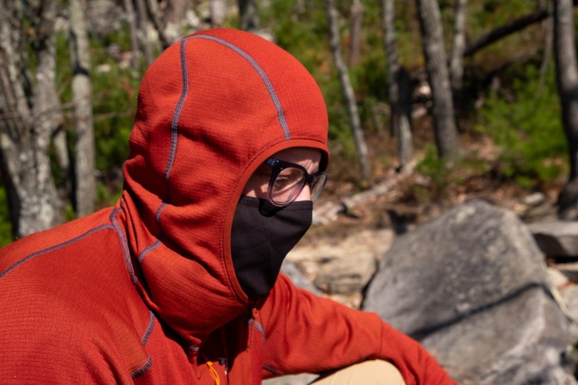 In this test, we put this fleece pullover toe to toe with the R1. A few of the significant differences include a shorter zipper, a shorter hemline, and the addition of face mask, a feature that we feel provides more comfortable coverage than the R1's just “zip it up to your nose” strategy.